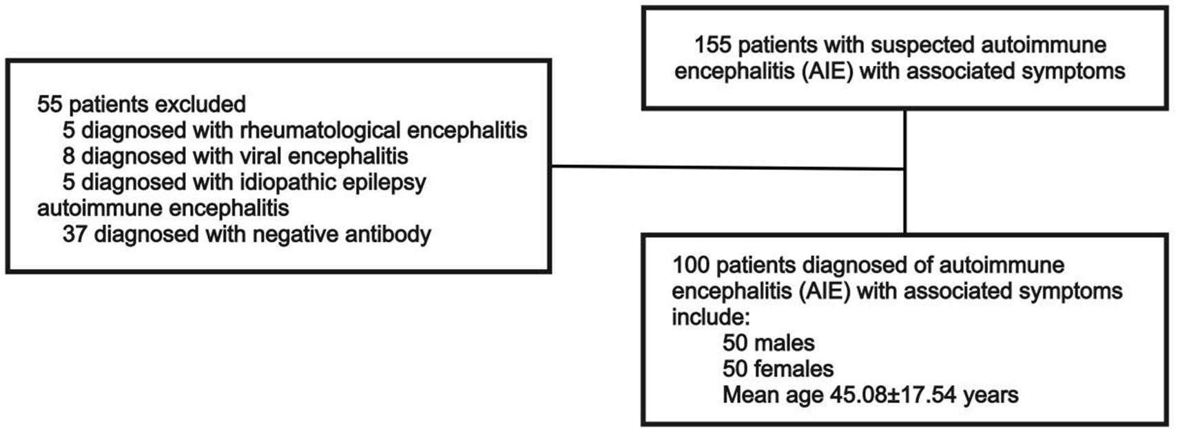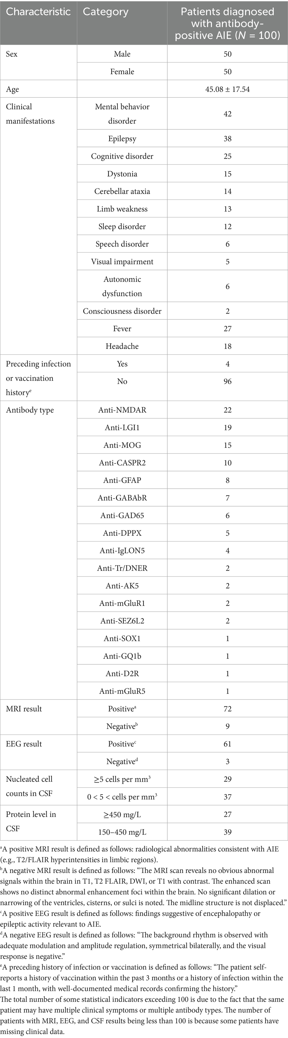 The analysis included 100 selected antibody-positive patients with AIE treated at Ruijin Hospital, affiliated with Shanghai Jiao Tong University School of Medicine, between March 15, 2022, and February 15, 2025. These 100 patients were retrospectively selected based on the availability of complete clinical data and confirmed antibody positivity. These criteria were necessary to minimize potential bias caused by missing diagnostic data. The diagnostic criteria for AIE follow those established by Graus et al. (2016). Accordingly, patients with symptoms associated with COVID-19 recovery or brain fog caused by chemotherapy or polypharmacy were excluded. Patients’ medical histories were screened to confirm positive results for the following antibodies in serum and CSF, which are indicative of AIE: NMDAR, CASPR2, LGI1, AMPAR1, AMPAR2, GABAbR, GlyRa1, DPPX, IgLON5, mGluR1, mGluR5, D2R, NRXN3A, KLHL11, GluK2, AK5, VGCC, MOG, GFAP, and onconeural antibodies (Hu, Yo, Ri, Ma2, Ma1, CV2/CRMP5, amphiphysin, Tr/DNER, SOX1, Titin, Zic4, Recoverin, PKC γ, and GAD65). All antibody results were verified using a dual-confirmation approach. Antibodies detected by either cell-based assay (CBA) or immunoblot (BLOT) were further confirmed by tissue-based assay (TBA) whenever possible, ensuring higher diagnostic confidence. Only patients double-positive for antibodies in serum and CSF, with titers ≥1:100 in both compartments, as measured by CBA and who exhibited clinical symptoms were included in the analysis (Figure 1).