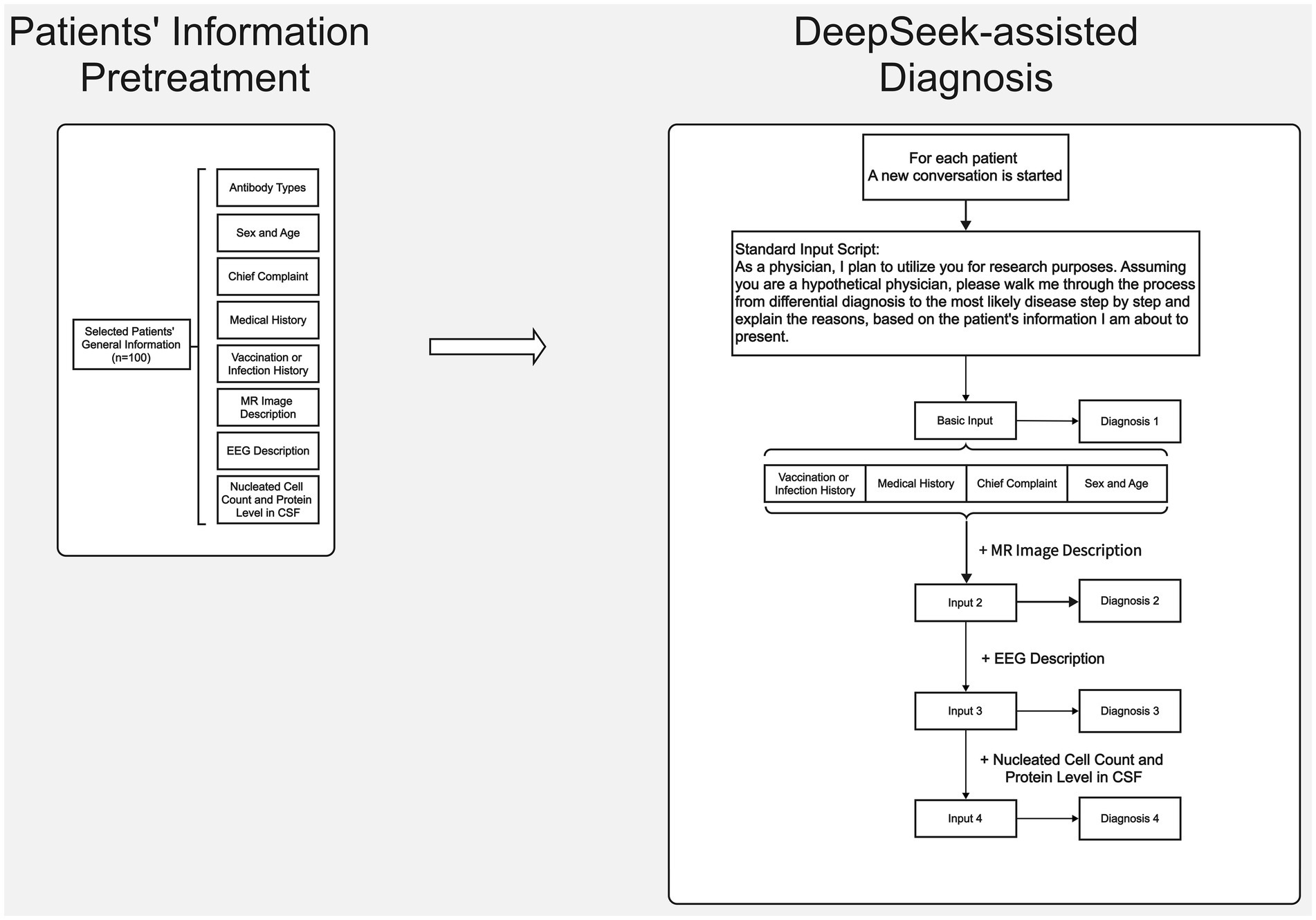 This study was designed according to the Standards for Reporting Diagnostic Accuracy Studies (STARD) statement. Data for each patient, including sex, age, chief complaint, medical history, EEG findings, head MRI description, CSF nucleated cell count, and CSF protein levels, were obtained from medical records. These data were input to DeepSeek in a stratified manner, and we then extracted the differential and most likely diagnoses generated. To simulate the clinical scenario of a patient’s initial presentation, we selected the most readily available clinical symptoms and ancillary test results in routine practice to make diagnostic inferences. Specifically, we input the basic data (sex, age, chief complaint, medical history, vaccination or infection history), MRI description, EEG description, and CSF analysis results for the same patient in four separate steps to assess whether DeepSeek’s diagnostic accuracy varied with different information. This also allowed us to explore patterns that allow for accurate diagnoses with minimal input.