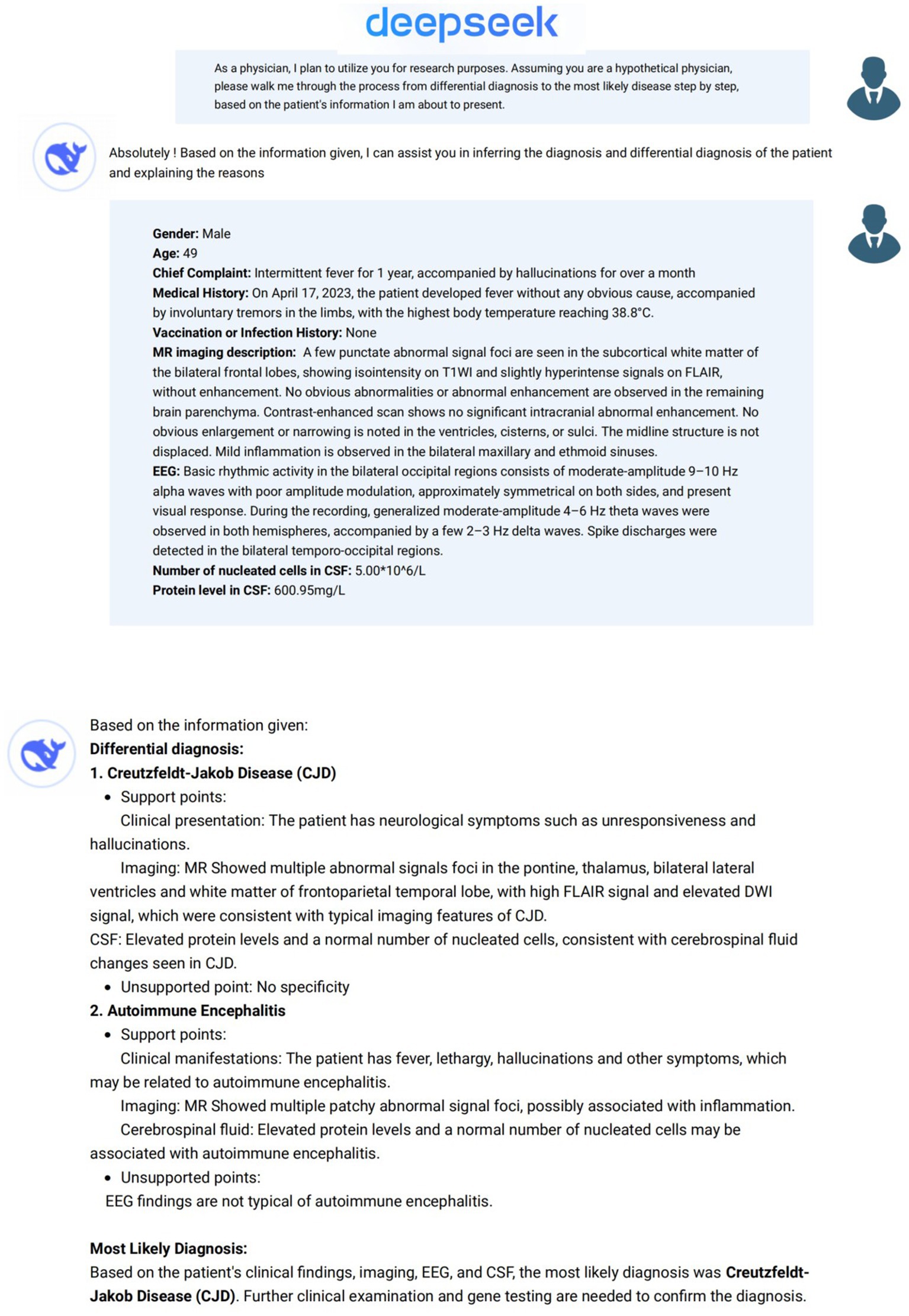 Analysis of patient data using DeepSeek was performed between February 15, 2025 and March 5, 2025 (Figures 2, 3). To provide background for our request, the following description was first entered into DeepSeek-V3 (2024-12-26 Version, https://chat.deepseek.com/): As a physician, I plan to utilize you for research purposes. Assuming you are a hypothetical physician, please walk me through the process from differential diagnosis to the most likely disease step by step, based on the patient information I am about to present (Horiuchi et al., 2024). We then input the general information, MRI description, EEG description, and CSF analysis results (nucleated cell count and CSF protein levels) for each patient in four separate steps. In line with institutional ethical standards and standard research protocols, we removed any personally identifiable information from each patient’s data and any details regarding antibody testing or immunosuppressive treatment that might strongly suggest AIE. As the primary aim of our study was to simulate a real-world clinical scenario, particularly at the early diagnostic stage in emergency or outpatient settings where clinicians often make decisions with incomplete data. Thus, we deliberately excluded diagnostic clues such as antibody test results, antibody titers, CSF next-generation sequencing (NGS), and treatment response from the input data. This process ensured that the input data described only the patient’s clinical symptoms and paraclinical data (e.g., MRI, EEG, and CSF findings). The formal EEG and MRI descriptive reports issued by senior clinical neurophysiology and radiology experts, not the final EEG or MRI conclusions, were input. To ensure consistency and quality across cases, all input data were reviewed in two rounds by senior EEG and radiology specialists. The revised medical history input data were reviewed and approved by a senior neurologist with 20 years of clinical experience (CS). The differential diagnoses and most likely diagnosis provided by DeepSeek as answers to each step were extracted. A new DeepSeek session was initiated for each case to avoid the influence of prior answers on the output.