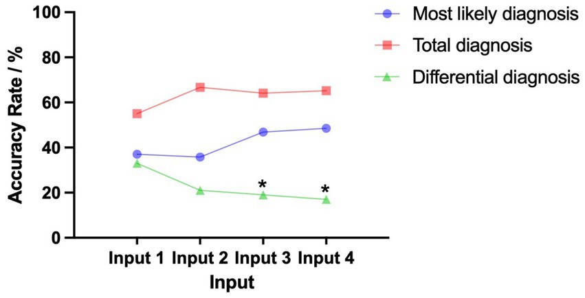 Figure 4. Trends of the most likely and total diagnosis accuracy rate given the basic input followed by inputting the MRI description, EEG description, and CSF results. For the 100 antibody-positive AIE patients included in the analysis, pairwise comparisons between Input 1, Input 2, Input 3, and Input 4 showed no significant differences for the total diagnosis. There were also no significant differences for the most likely diagnosis. However, for differential diagnosis, the accuracy rate of Inputs 3 and 4 was significantly lower (p < 0.05). We consider cases where “autoimmune encephalitis” appears in either the most likely diagnosis or differential diagnosis as a positive result. Input 1 includes basic input (sex, age, chief complaint, medical history, and vaccination or infection history). Input 2 includes basic input and MRI description. Input 3 includes basic input, MRI description, and EEG description. Input 4 includes basic input, MRI description, EEG description, and CSF results. *p < 0.05 (vs Input 1, exploratory result).