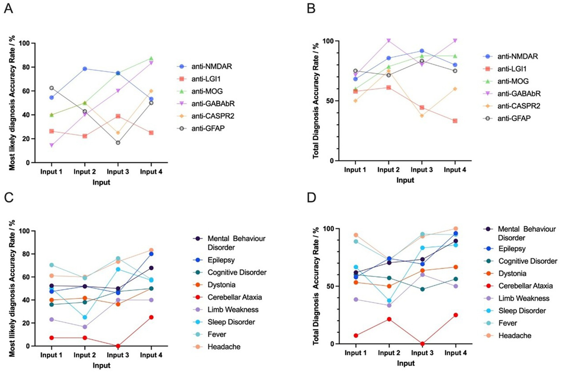 Figure 5. The most likely and total diagnosis accuracy rates given basic input and further input (MRI description, EEG description, and CSF results) between different antibodies and symptoms. Among the 100 antibody-positive AIE patients included in the analysis, 17 types of AIE antibodies were observed. The six highest-ranked DeepSeek-classified AIE-associated antibodies (n ≥ 5) that demonstrated non-negative diagnostic validity underwent comparative evaluation. A,B show the trend of the most likely and total diagnosis accuracy rate for different antibodies. Among the 100 AIE patients, 14 clinical manifestations were observed. The nine highest-ranked symptoms (n ≥ 5) demonstrating non-negative diagnostic validity underwent comparative evaluation. C,D indicate the trend of the most likely and total diagnosis accuracy rate for different symptoms. For statistical robustness, only subgroups with n ≥ 5 were included. Inter-antibody and inter-symptom diagnostic performance heterogeneity were quantified and followed by statistical validation through Input 4-based hypothesis testing (Fisher’s exact test and Chi-square test, α = 0.05). Input 1 includes basic input (sex, age, chief complaint, medical history, and vaccination or infection history). Input 2 includes basic input and MRI description. Input 3 includes basic input, MRI description, and EEG description. Input 4 includes basic input, MRI description, EEG description, and CSF results.