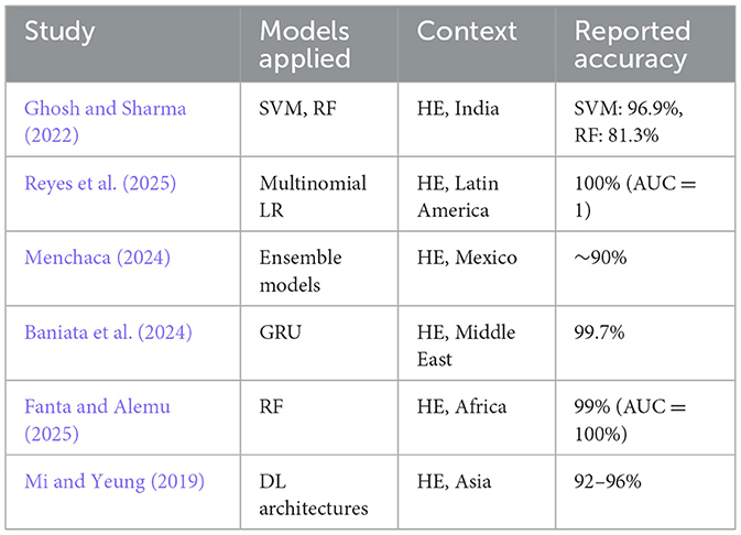 Table 1 summarizes representative studies from the literature, highlighting models used, datasets, and reported accuracies. As shown, ensemble approaches often outperform single models by combining complementary strengths (Menchaca, 2024), yet hybrid ML+DL ensembles remain underexplored in RBE contexts.
