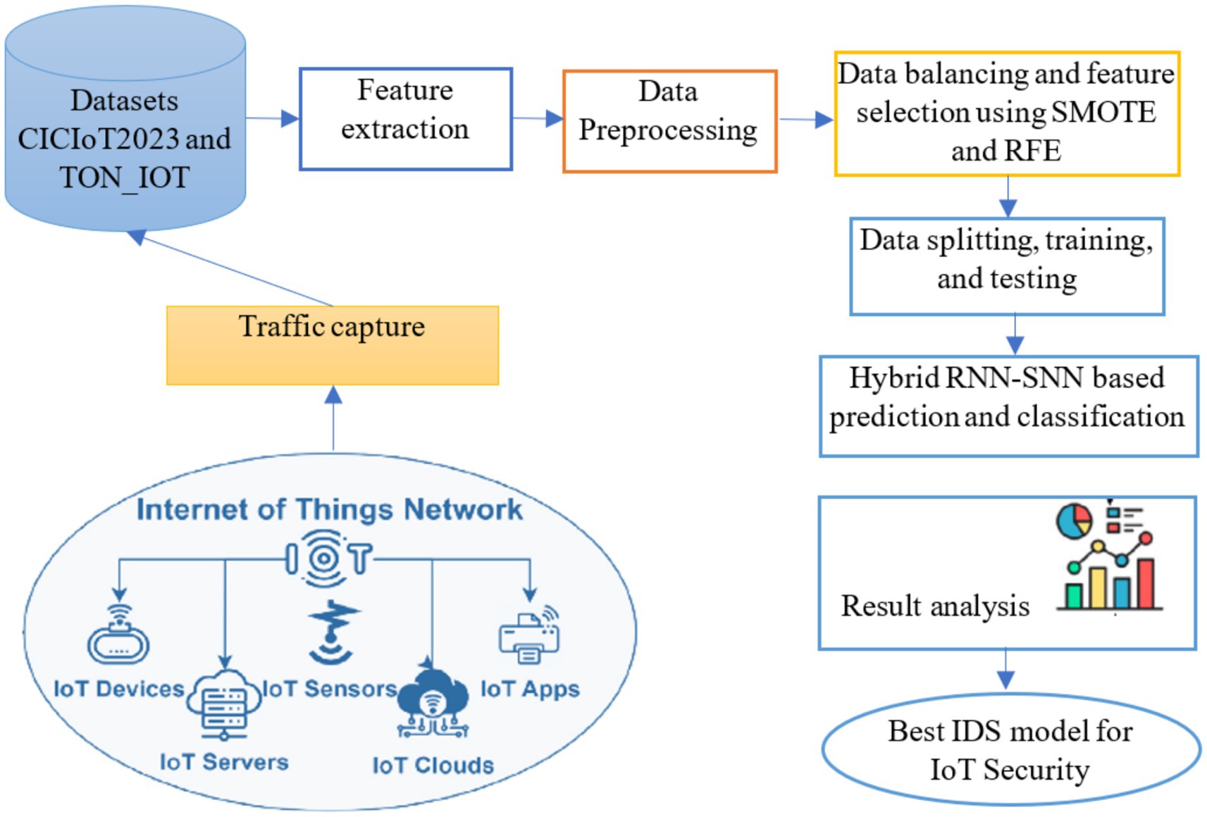 Flowchart illustrating the process for developing the best IDS model for IoT security. It begins with datasets (CICIoT2023 and TON_IOT), followed by feature extraction, data preprocessing, data balancing and feature selection using SMOTE and RFE. Data is split, trained, and tested, leading to hybrid RNN-SNN prediction and classification. Result analysis determines the best model. Traffic capture occurs at the IoT network level, involving devices, sensors, servers, clouds, and apps.