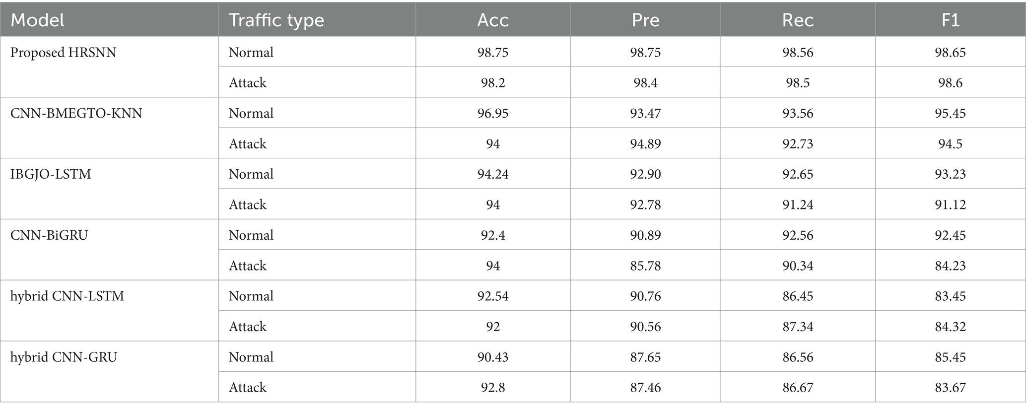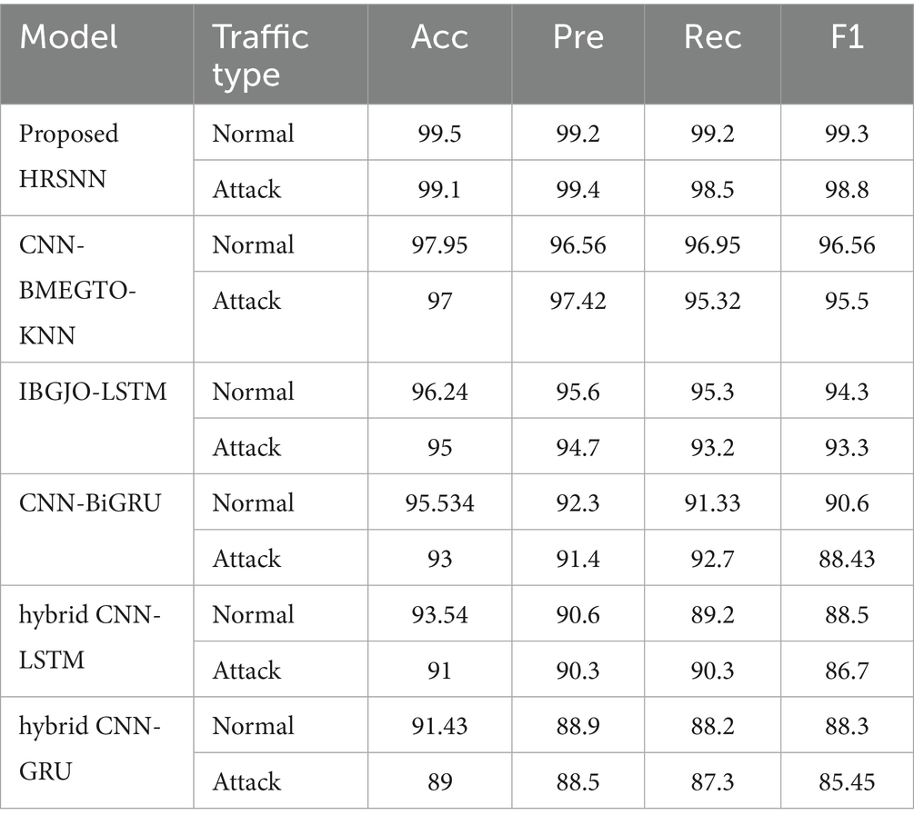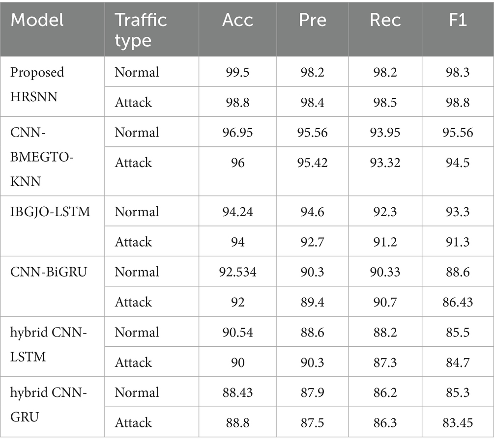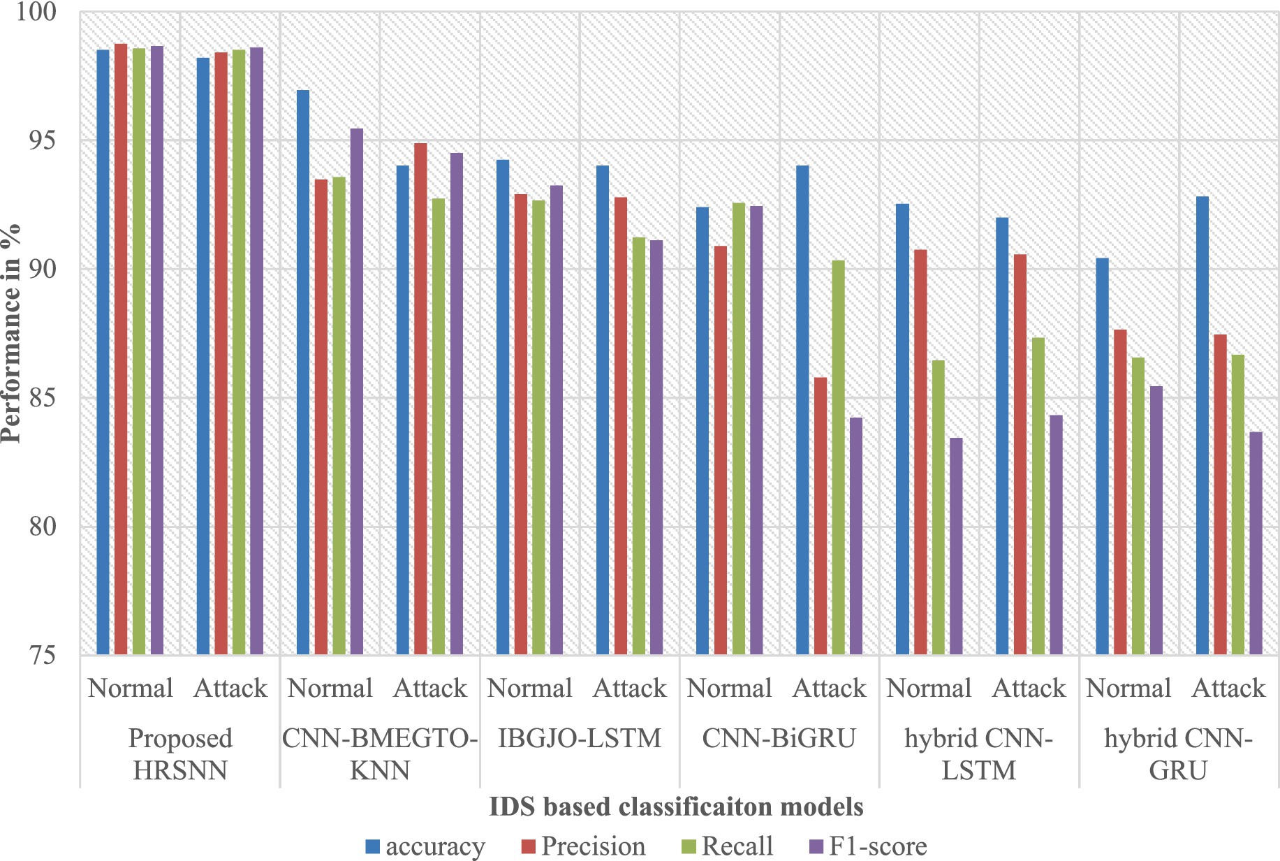 Methods: The proposed HRSNN technique has five steps: preprocessing data, extracting features, equalization classes, features optimization and classification. Data processing step makes sure that input data is accurate and consistent and by employing normalization and the removal of outliers’ techniques. Feature extraction makes use of the RNN part to automatically detect abnormal patterns and high-level features, which are then turned into spike trains for the SNN to process over time. In class equalization step, the Synthetic Minority-Oversampling Technique (SMOTE) is being used resulting in balanced classes. Recursive Feature Elimination (RFE) is used to keep the important features for feature optimization. Then, the dataset is split into sets for testing and training so that the model can be tested properly.