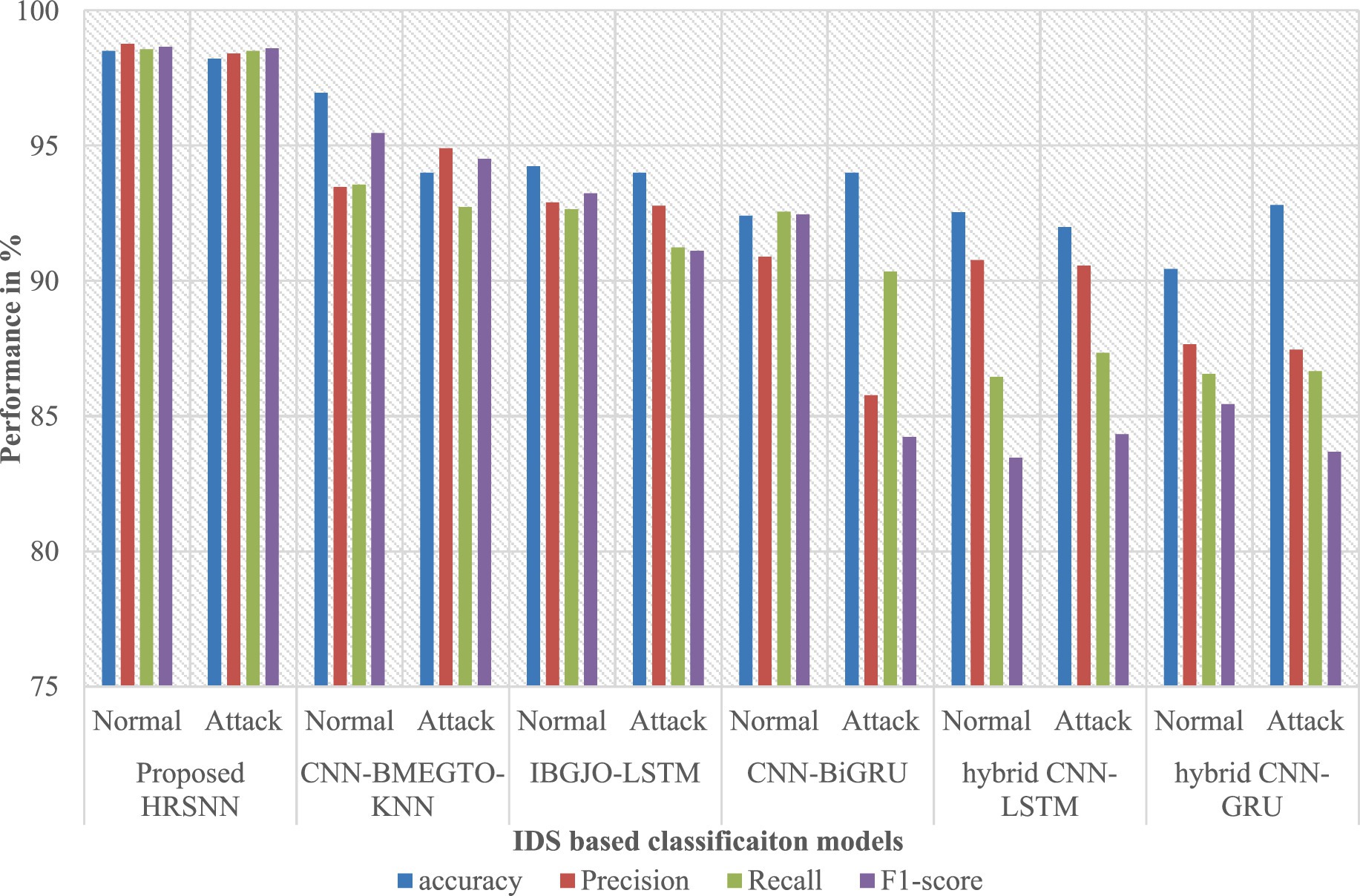 It was stated that IDS models can track network traffic and find DDoS attacks, and that ML and DL models to perform tasks effectively. The system used the accuracy, f-measure, and other metrics to test the proposed hybrid strategy, which combines SNN and RNN and compared it to other standard ML and DL methods.