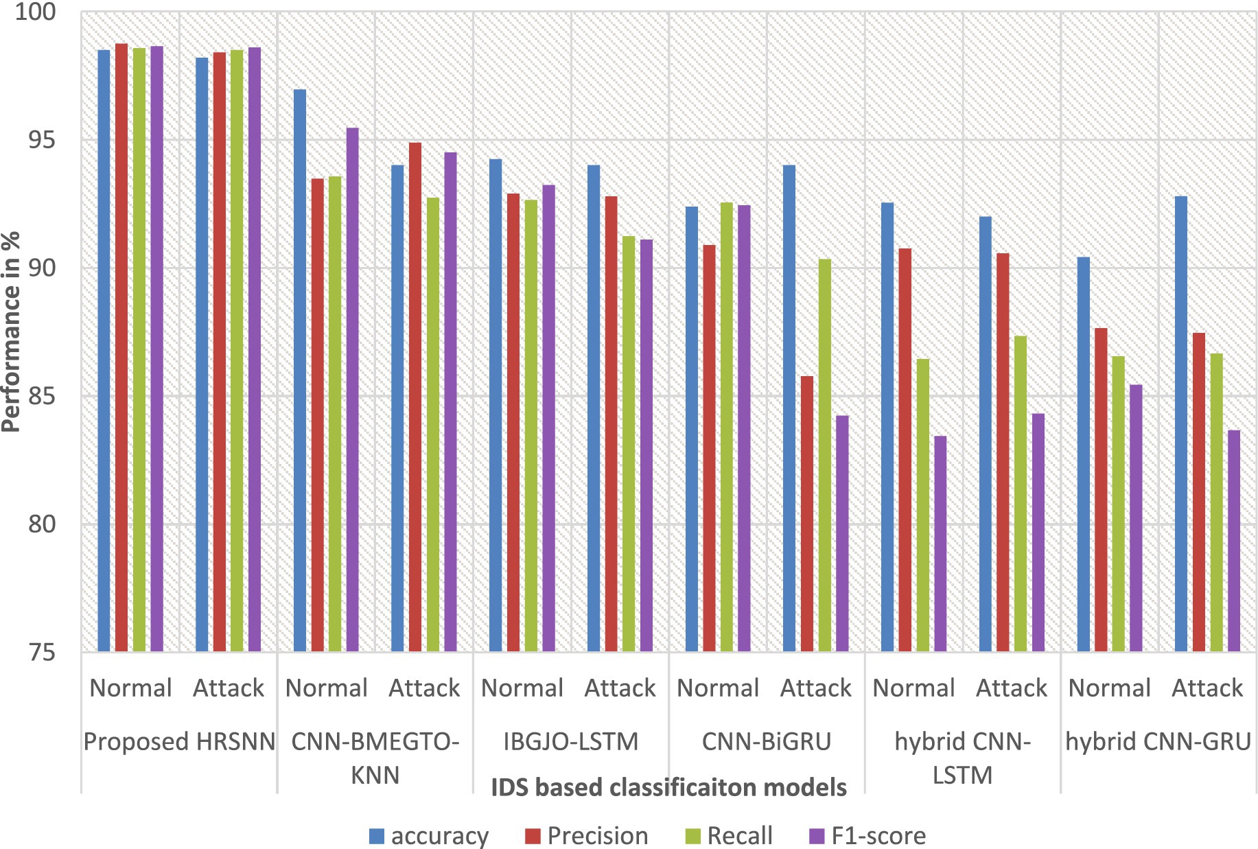 Discussion: These results confirm demonstrate that the proposed architecture of RNN and SSN can achieve significant advancement to IoT security. By combining both spatial and temporal feature learning, HRSNN can improve accuracy detection against diverse security threats. The model is reliable, accurate, and adaptable for safeguarding IoT networks against diverse security threats. Thus, the model addresses the potential solutions in the challenging problem of secured IoT networks.