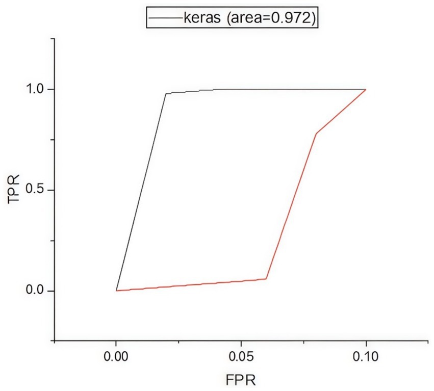 ROC curve on TON_IOT data showing the performance of a Keras model with a True Positive Rate (TPR) on the y-axis and a False Positive Rate (FPR) on the x-axis. The area under the curve is 0.972, indicating high model accuracy.