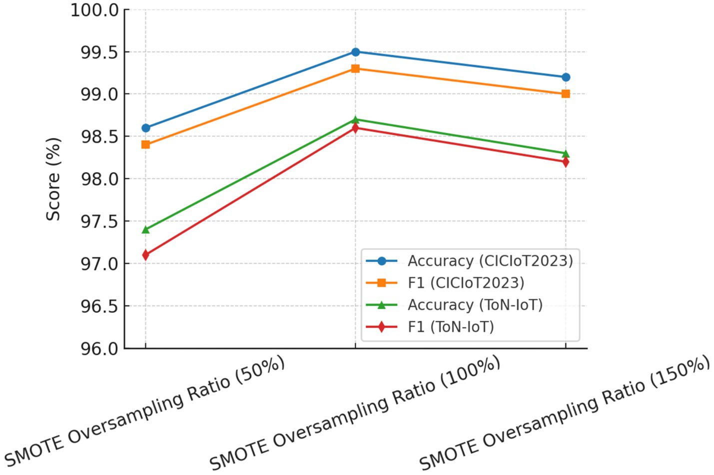 Line graph showing accuracy and F1 scores for CICloT2023 and ToN-IoT datasets across different SMOTE oversampling ratios: 50%, 100%, and 150%. Scores range from 97.0% to 99.0%, with peaks at 100% oversampling.