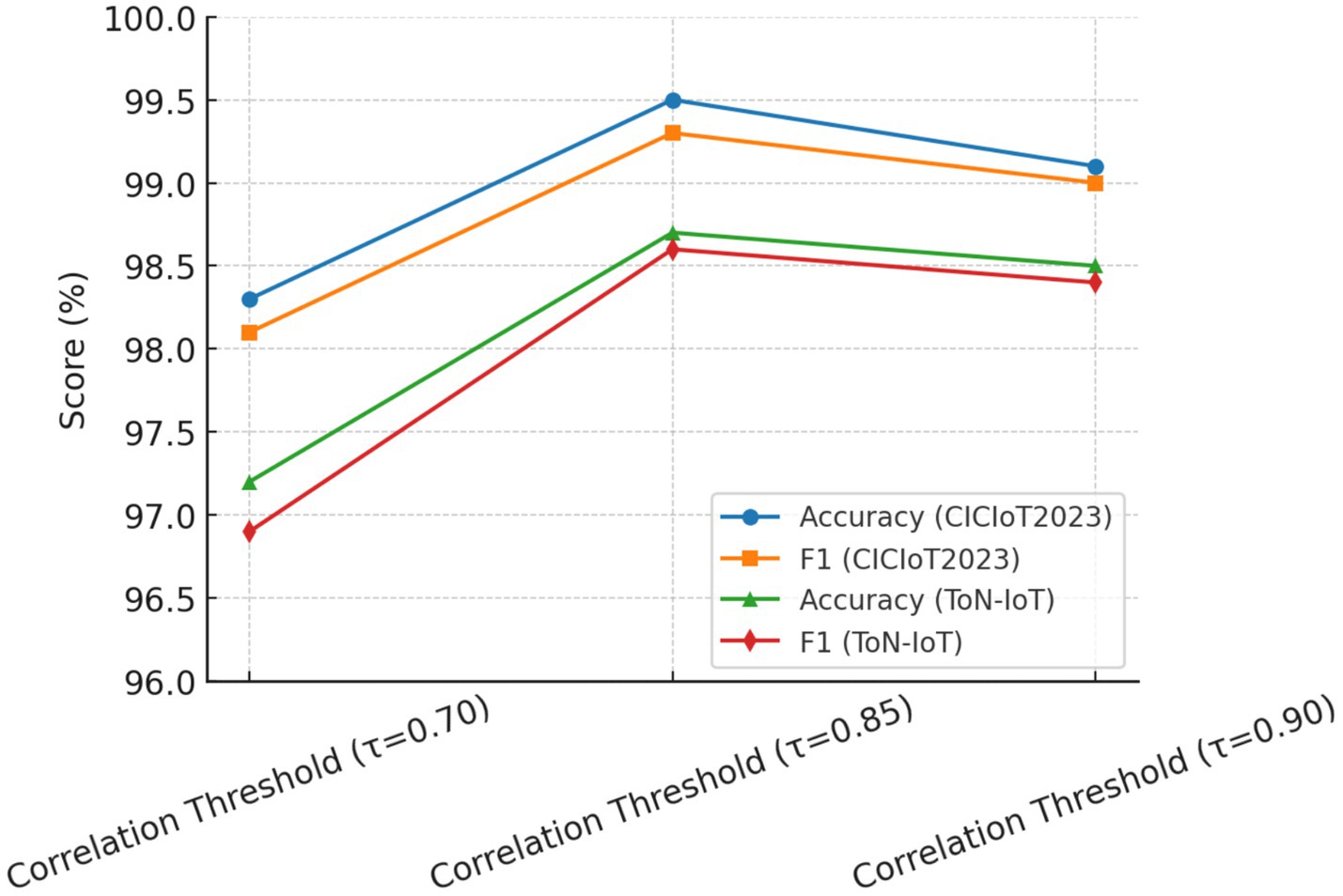 Line graph showing accuracy and F1 scores for CICIoT2023 and ToN-IoT datasets across correlation thresholds of 0.70, 0.85, and 0.90. Scores range from about 97 to 99.5 percent. CICIoT2023 generally scores higher than ToN-IoT.