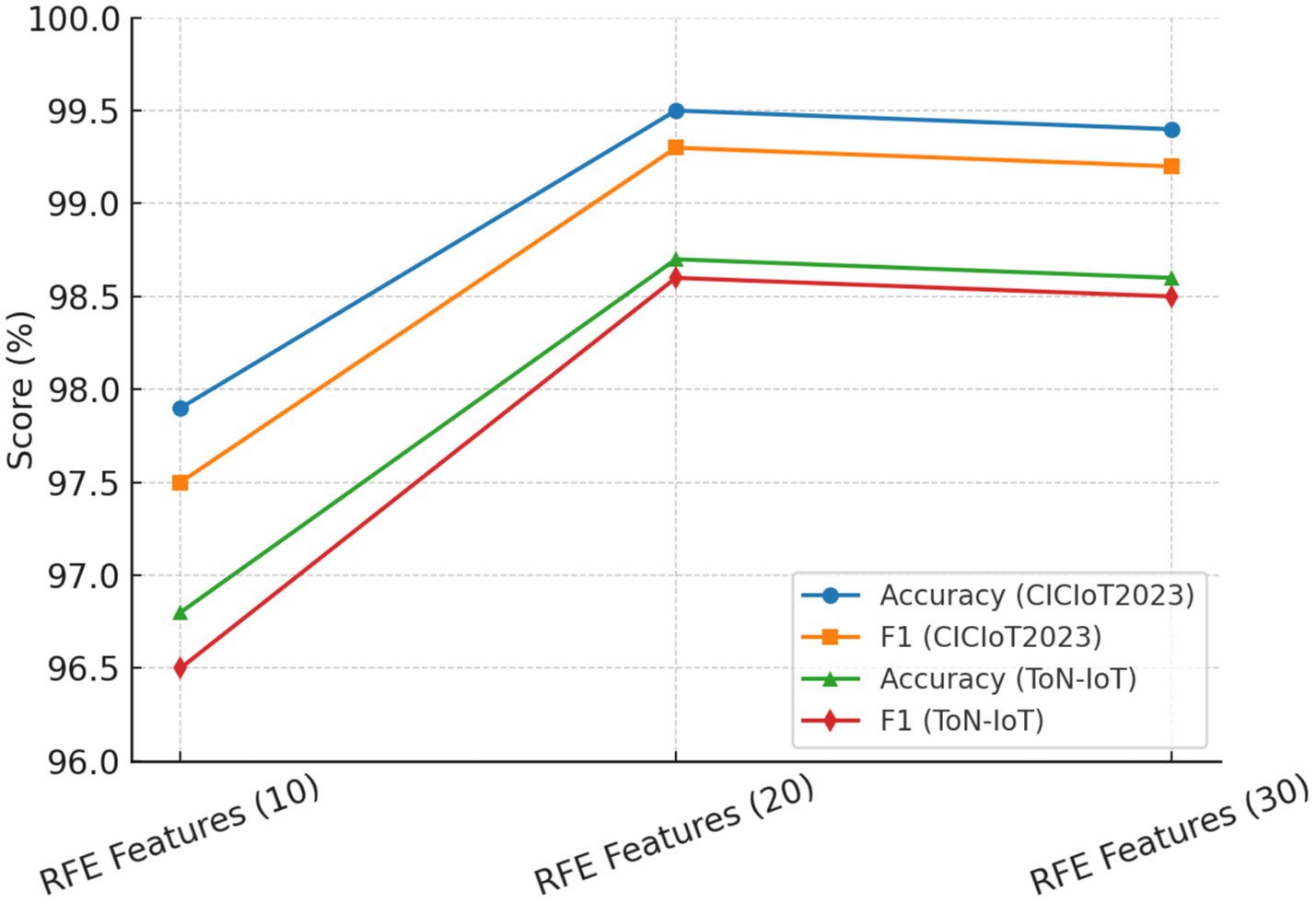 Line graph comparing accuracy and F1 scores for CICIoT2023 and ToN-IoT datasets with different RFE features. Accuracy increases for both datasets, peaking at twenty features, and slightly decreases at thirty. F1 mirrors accuracy trends, with CICIoT2023 scores consistently higher.