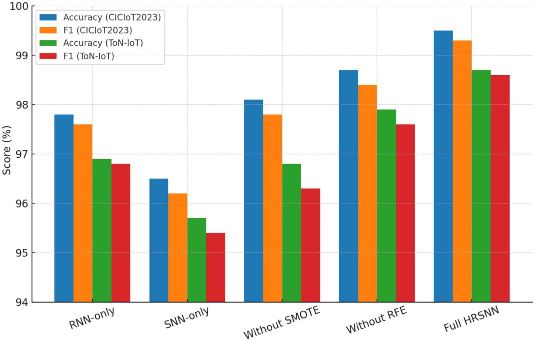 Bar chart comparing accuracy and F1 scores for different configurations: RNN-only, SNN-only, without SMOTE, without RFE, and Full HRSNN. Scores are measured for CICIoT2023 and ToN-IoT datasets. Full HRSNN shows the highest scores, above 98 percent for both datasets, with varying performance across configurations.