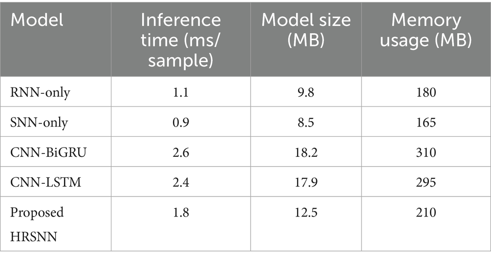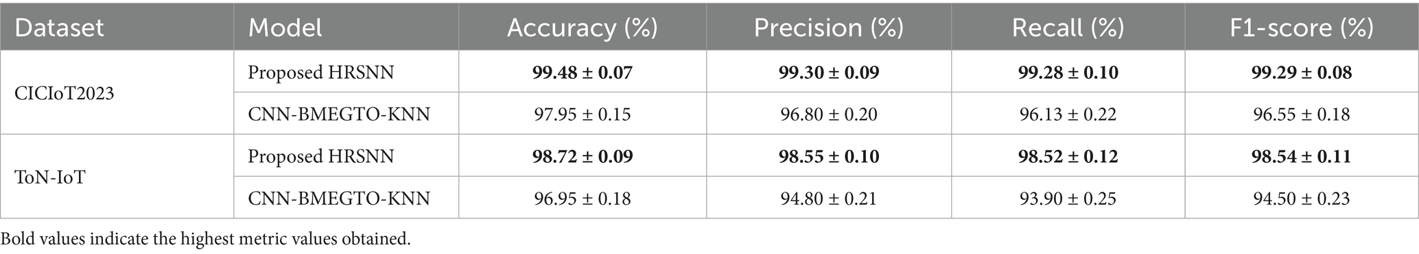 Besides detection accuracy, a comparative study of computational efficiency was presented for the proposed HRSNN model against existing baselines. Three important parameters were: latency during inference per sample, size of the model (MB), and memory occupation during execution. The experiments were carried out in the same testbed (Intel i7, 16 GB RAM), and records of the metrics were kept for both datasets, i.e., CICIoT2023 and ToN-IoT datasets. Table 8 summarizes the comparative results. In terms of inference time, the HRSNN lies in the range of moderate inference with 1.8 ms/sample, which is more than the single RNN or SNN models but is much less compared to other hybrids like CNN-BiGRU and CNN-LSTM. As for the model size (12.5 MB) and peak memory usage (210 MB), they are acceptable within the capabilities of mid-range IoT gateways and edge devices, e.g., Raspberry Pi 4 with 4–8 GB RAM. These results portray a hybrid architecture having slightly more computation than others but that pays for this with improved accuracy and robustness. Hence, the HRSNN model is a viable option for implementation in IoT edge devices and fog computing gateways, especially if lightweight optimizations such as pruning or quantization are applied.