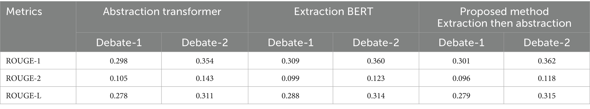 Our first abstractive summarization, using Debate-1, achieved scores of 0.298 ROUGE-1, 0.105 ROUGE-2, and 0.278 ROUGE-L. Our next summarization was extractive, using the same dataset, and achieved scores of 0.309 ROUGE-1, 0.099 ROUGE-2, and 0.288 ROUGE-L. For the third trial with this dataset, we first performed an extractive summarization by transformer, sending the summarized text to the abstractive BART layer to generate the final summary. This method achieved higher ROUGE-1 (0.301) and ROUGE-L scores (0.279) than abstractive summarization alone, although its ROUGE-2 score was slightly lower, at 0.096.