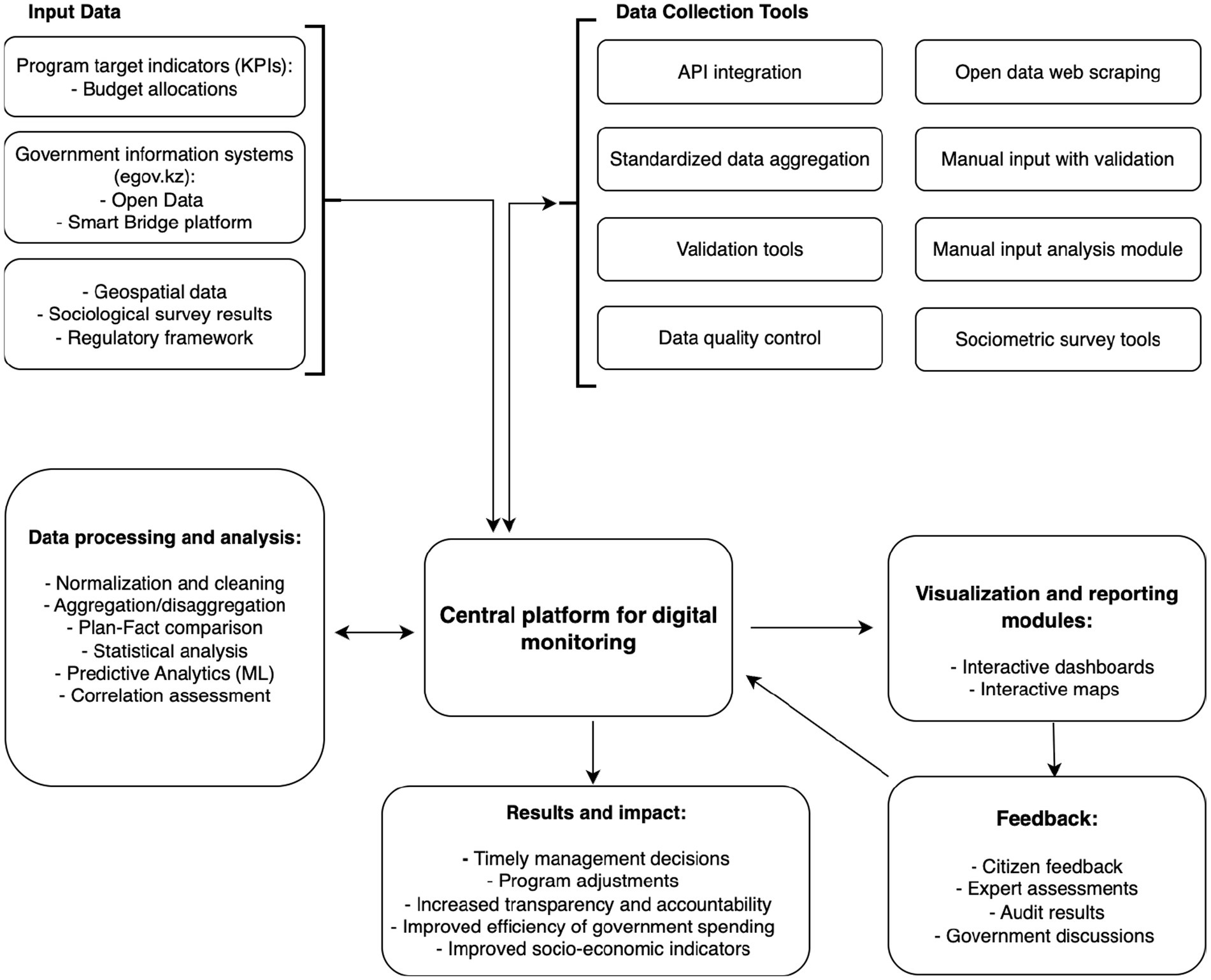 In the context of accelerated digitalization of public administration, the issue of effectiveness and transparency in the implementation of national programs becomes critically important. Despite significant investments in e-government development and the implementation of platform solutions (such as egov.kz, Smart Bridge, Open Data), traditional monitoring approaches in Kazakhstan, as in many other countries, face fundamental problems. These problems include data fragmentation, lack of real-time performance tracking mechanisms, focus on formal reporting rather than actual socio-economic results, and low adaptability to rapidly changing conditions. As a result, this impedes timely, evidence-based management decisions and reduces the overall effectiveness of government initiatives.