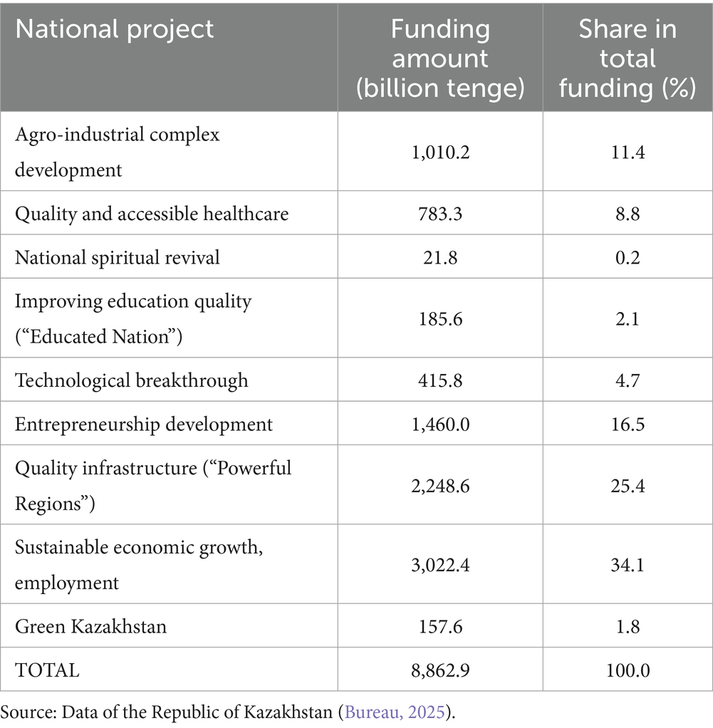 As seen from Table 1, national projects receive significant funding, with the largest share (34.1%) allocated to the sustainable economic growth and employment project, followed by the quality infrastructure development project (25.4%). Projects related to the social sphere, such as healthcare and education, receive a relatively smaller share of funding, which may require special attention to the efficiency of allocated funds usage.