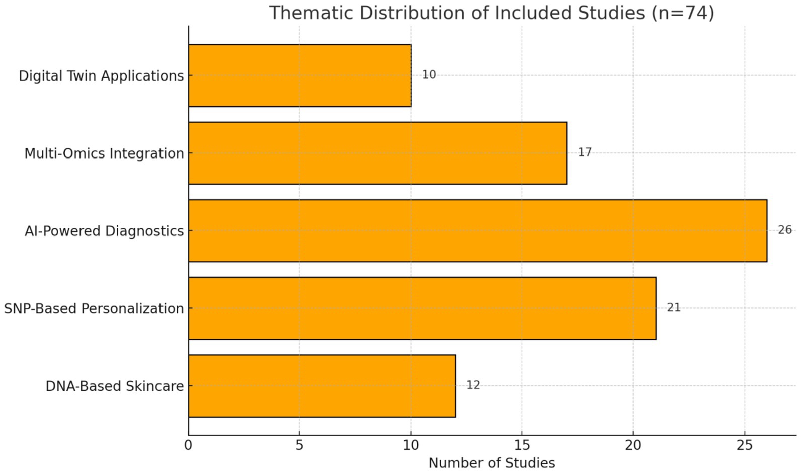 A total of 403 articles were initially identified. After duplicate removal and screening of titles and abstracts, 325 studies remained for further consideration. Among these, 120 full-text articles were assessed in detail, and 74 met eligibility criteria for inclusion. The article selection process is outlined in Figure 1. Due to heterogeneity in study designs and reported outcomes, a qualitative thematic synthesis was performed. Studies were grouped based on their primary focus (e.g., SNPs, AI tools, multi-omics, digital twins); however, several studies addressed multiple thematic areas and were therefore represented in more than one category. (Figure 2).