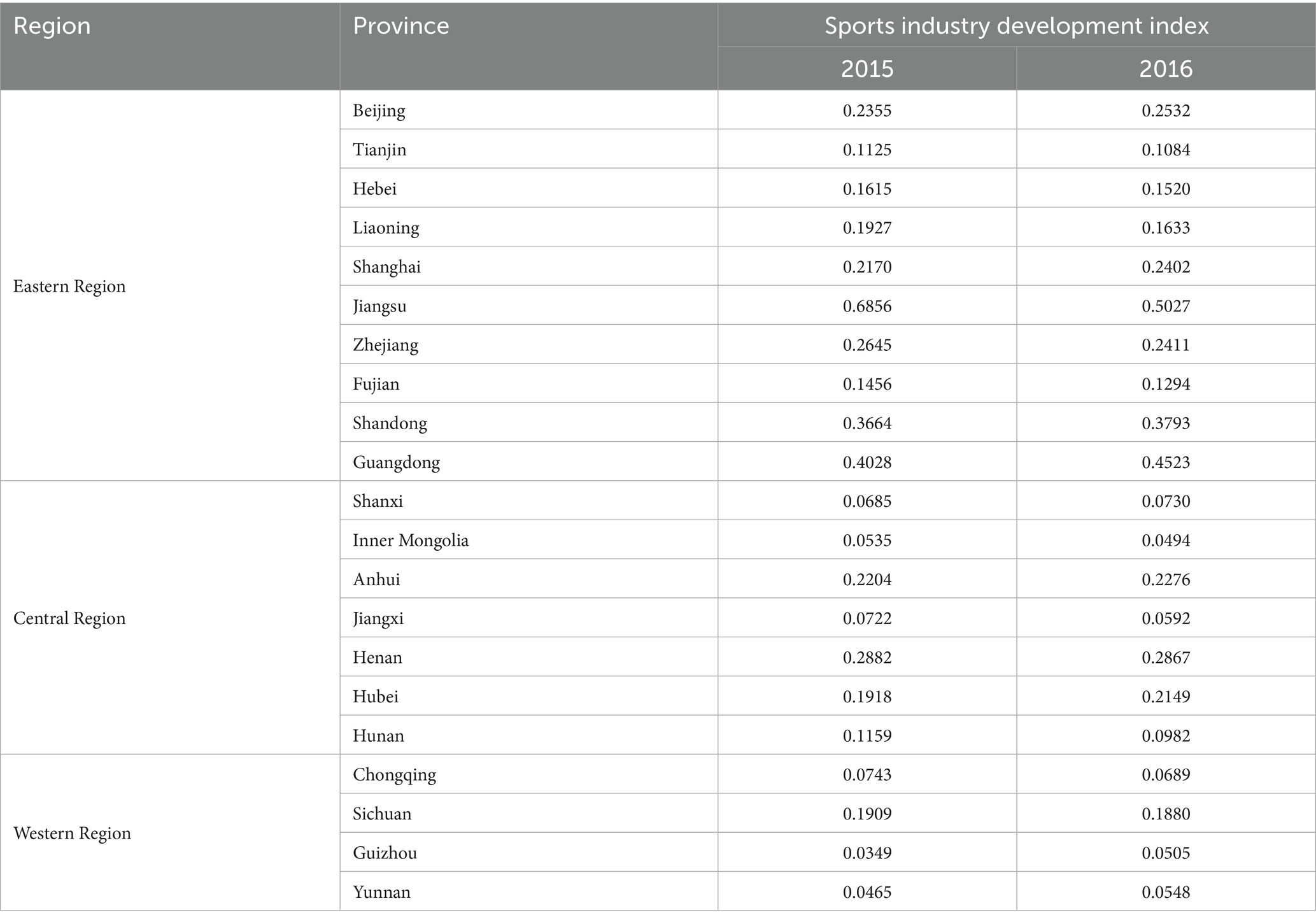 Based on the above formula, the comprehensive development index of the sports industry for each province is calculated as shown in the Table 2 below (taking the years 2015 and 2016 as examples).