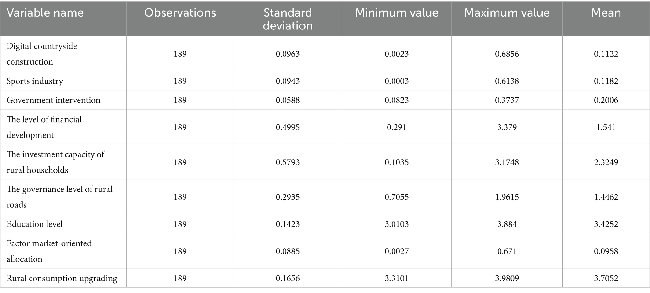 To ensure a more accurate assessment of the relationship between DCC and the development of the sports industry, control variables should be introduced to account for confounding factors that may exert potential impact. Building upon the research endeavors of previous scholars, five control variables that may affect the development of the sports industry were identified: (1) Government intervention (Gov), as adopted by Bidayu (2025), is represented by the ratio of general public budget revenue to general public expenditure; (2) The level of financial development (Fin), as used by Yang et al. (2025) and others, is measured as the ratio of total deposits and loans of regional financial institutions to the region’s gross domestic product (GDP); (3) The investment capacity of rural households (Fic), as referenced by Yu, (2024), is measured by per capita fixed asset investment by rural households; (4) The governance level of rural roads (Roa), as utilized by Tian et al. (2024), is calculated as ((\text{total road mileage} − \text{highway mileage} − \text{first-class highway mileage}) / \text{provincial land area}) × 100; (5) Education level (Edu), as employed by Liu (2025), is measured by the number of high school students per 100,000 people.