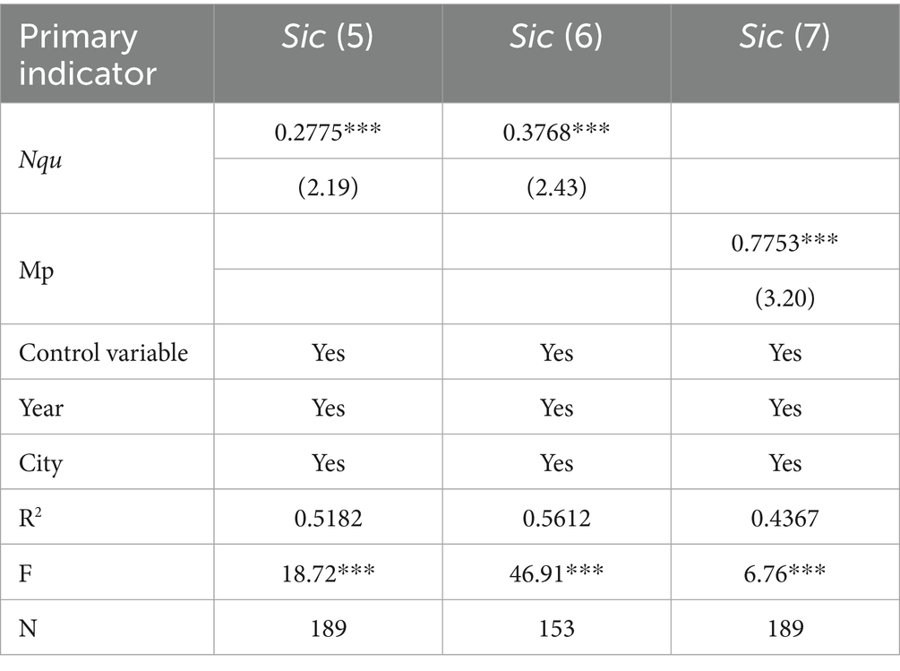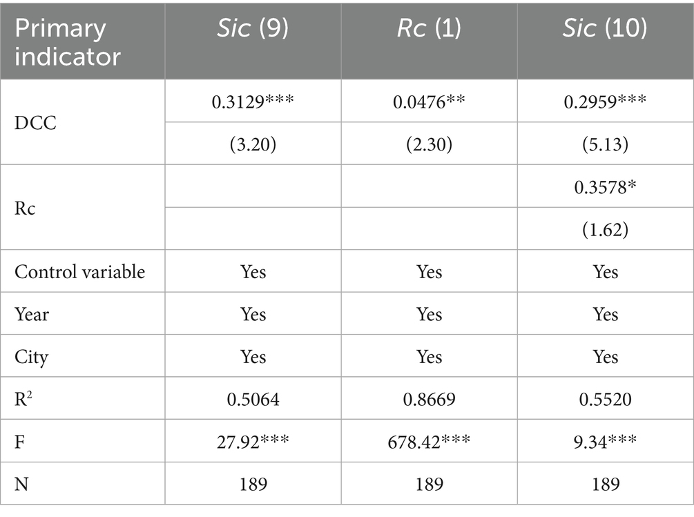 Model Sic (1) presents the baseline regression without control variables. Model Sic (2) includes control variables but omits fixed effects, while Model Sic (3) incorporates both control variables and regional and temporal fixed effects. In all three models, the regression coefficients for digital countryside construction (DCC) are 0.3359, 0.3791, and 0.3129, respectively—all of which are positive and statistically significant at the 1% level. This suggests that digital countryside construction significantly promotes the development of the sports industry.