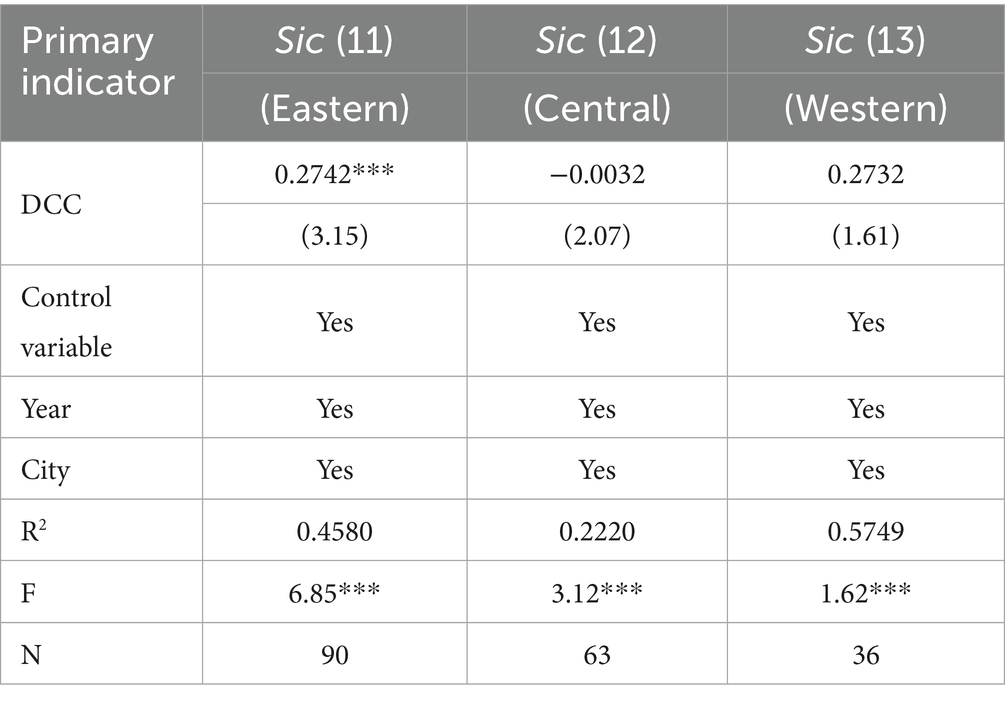 Given the substantial variations in natural conditions, economic resources, and development levels across different regions in China, a heterogeneity analysis was subsequently conducted, focusing on the regional divisions established by the National Bureau of Statistics. To examine the differential impact of DCC on the development of the sports industry across the entire country, the samples were classified into three primary regions: eastern China (including Beijing, Tianjin, Hebei, Liaoning, Shanghai, Jiangsu, Zhejiang, Fujian, Shandong, and Guangdong), central China (including Shanxi, Inner Mongolia, Anhui, Jiangxi, Henan, Hubei, and Hunan), and western China (including Chongqing, Sichuan, Guizhou, and Yunnan).