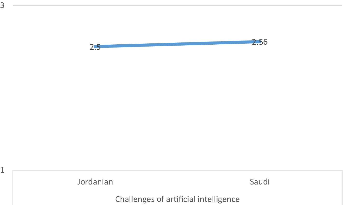 Figure 2 shows the differences between the average scores of Jordanian society and Saudi society in overcoming the challenges of artificial intelligence.