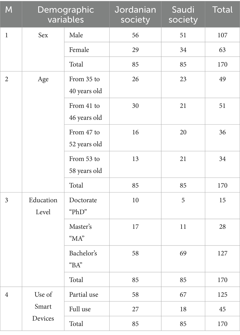 The study sample consisted of (170) participants from employees working in the artificial intelligence sectors in both the Hashemite Kingdom of Jordan and the Kingdom of Saudi Arabia, divided into (85 participants from the Jordanian community, and 85 participants from the Saudi community) whose ages ranged between 35 and 58 years, with an average age of (45.2 years), Table 1 shows the demographic characteristics of the study sample.