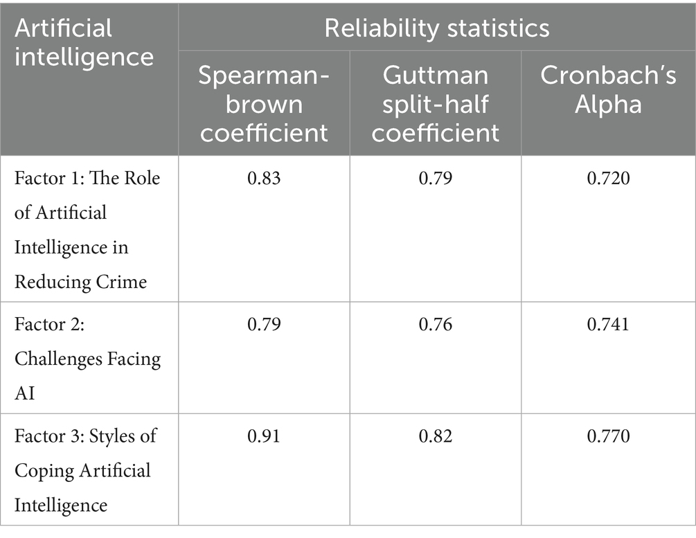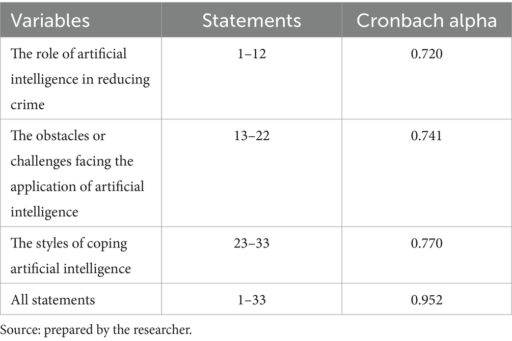 The current study questionnaire in its final form consists of (33) statements to measure artificial intelligence. These statements are distributed over three dimensions. The first dimension aims to identify the role of artificial intelligence in reducing crime and is represented by statements from (1:12). The second dimension aims to identify the challenges facing the application of artificial intelligence and is represented by statements from (13:22). The third dimension aims to identify the individual’s methods in facing such challenges and is represented by statements from (23:33). All of these statements are responded to through a three-point scale consisting of “yes, sometimes, no.” These responses are corrected by giving three marks for the response (yes), two marks for the response (sometimes), and one mark for the response (no). This is for statements with a positive direction. As for statements with a negative direction, one mark is given for the response under the weight (yes), two marks for the response under the weight (sometimes), and three marks under the weight (no).