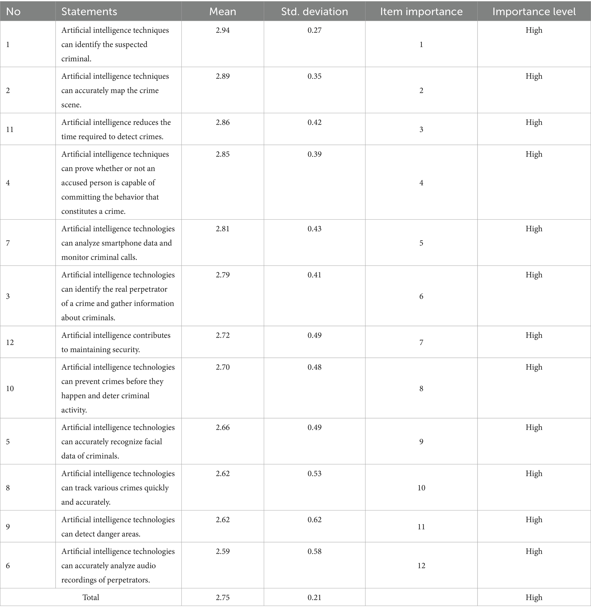 Table 4. Arithmetic mean, SD, item importance and importance level of the role of AI in reducing crime in descending order.