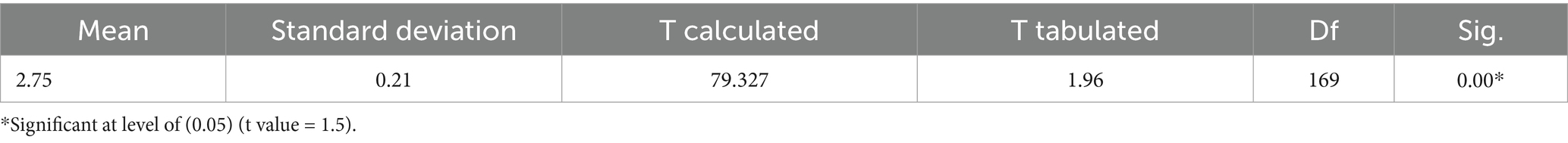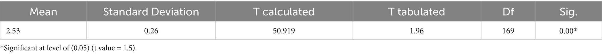 Table 7 showed that the mean value for the challenges facing Artificial intelligence in reducing crime was (2.53), which is a higher value than the default scale (1.5), and the standard deviation value was (0.26). (t) calculated value was of (50.919), which is a higher value than the tabulated (t) value, and the results showed the presence of statistically significant differences at (0.05) between the mean value of the scale and default mean value, which indicates the acceptance of the study hypothesis, which states: There are Challenges Facing Artificial intelligence in reducing crime.