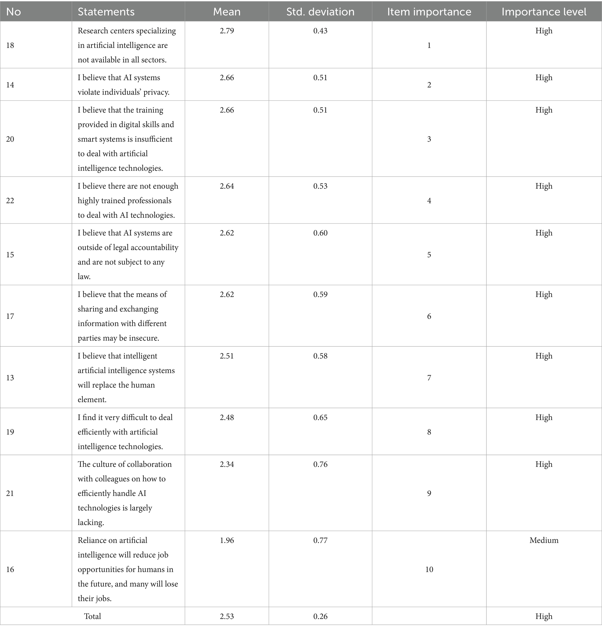 Table 6. Arithmetic mean, SD, item importance and importance level of the challenges facing artificial intelligence in reducing crime.