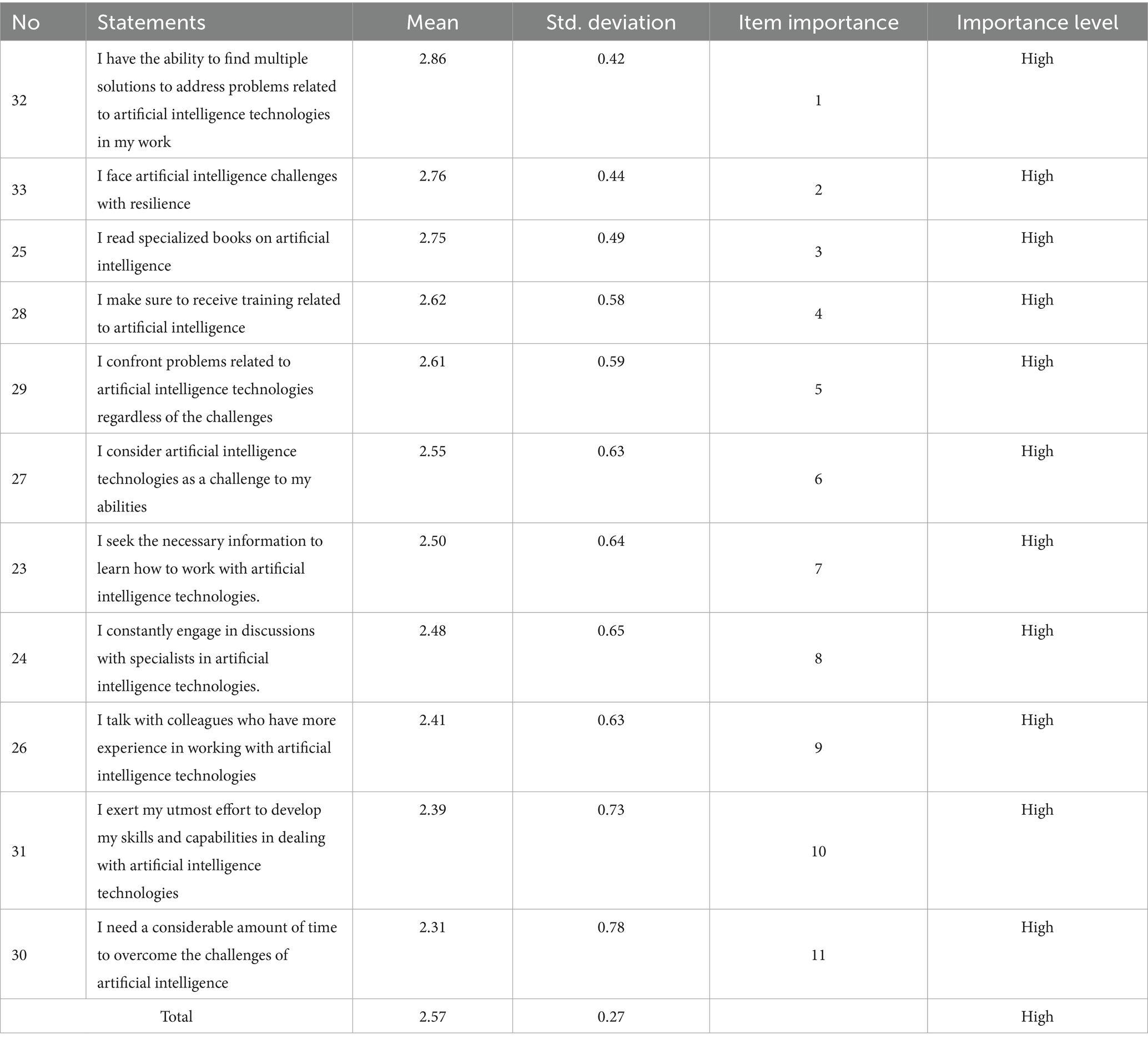 Statement (30) (I need a considerable amount of time to overcome the challenges of artificial intelligence) ranked last with mean of (2.31), and a standard deviation of (0.78), which is of a high level.