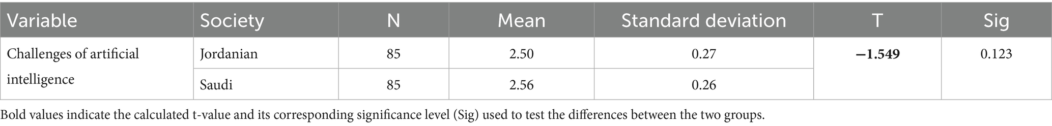 To verify the validity of the hypothesis, the researchers calculated the t-test value for the responses of the individuals participating in the study sample to statements indicating methods for facing the challenges of artificial intelligence. Table 10 shows the significance of the differences between the average scores of Jordanian and Saudi society in overcoming the challenges of artificial intelligence.