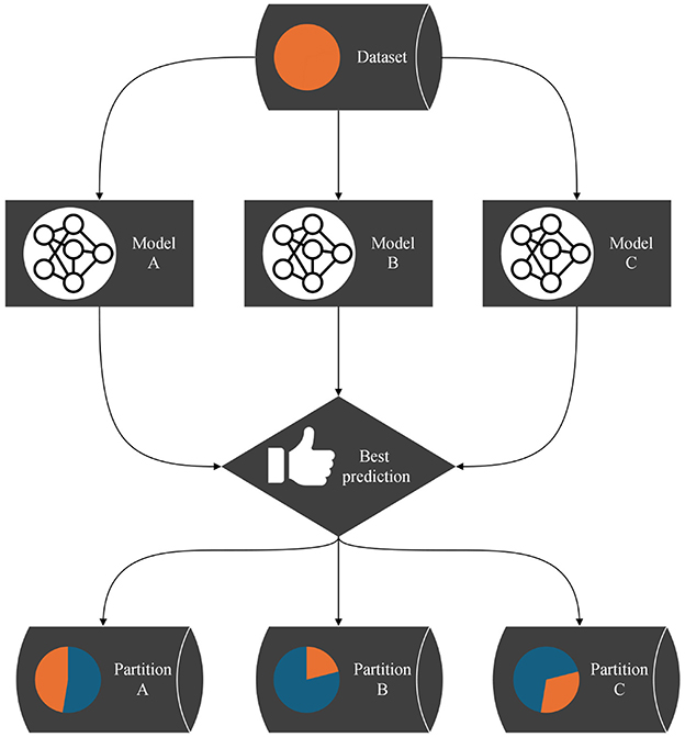 Figure 1. Flow chart of the partitioning algorithm: each data pointed is assigned to the model that submitted the best prediction. All models are trained with the data points in their partition for one epoch. This process is iterated.