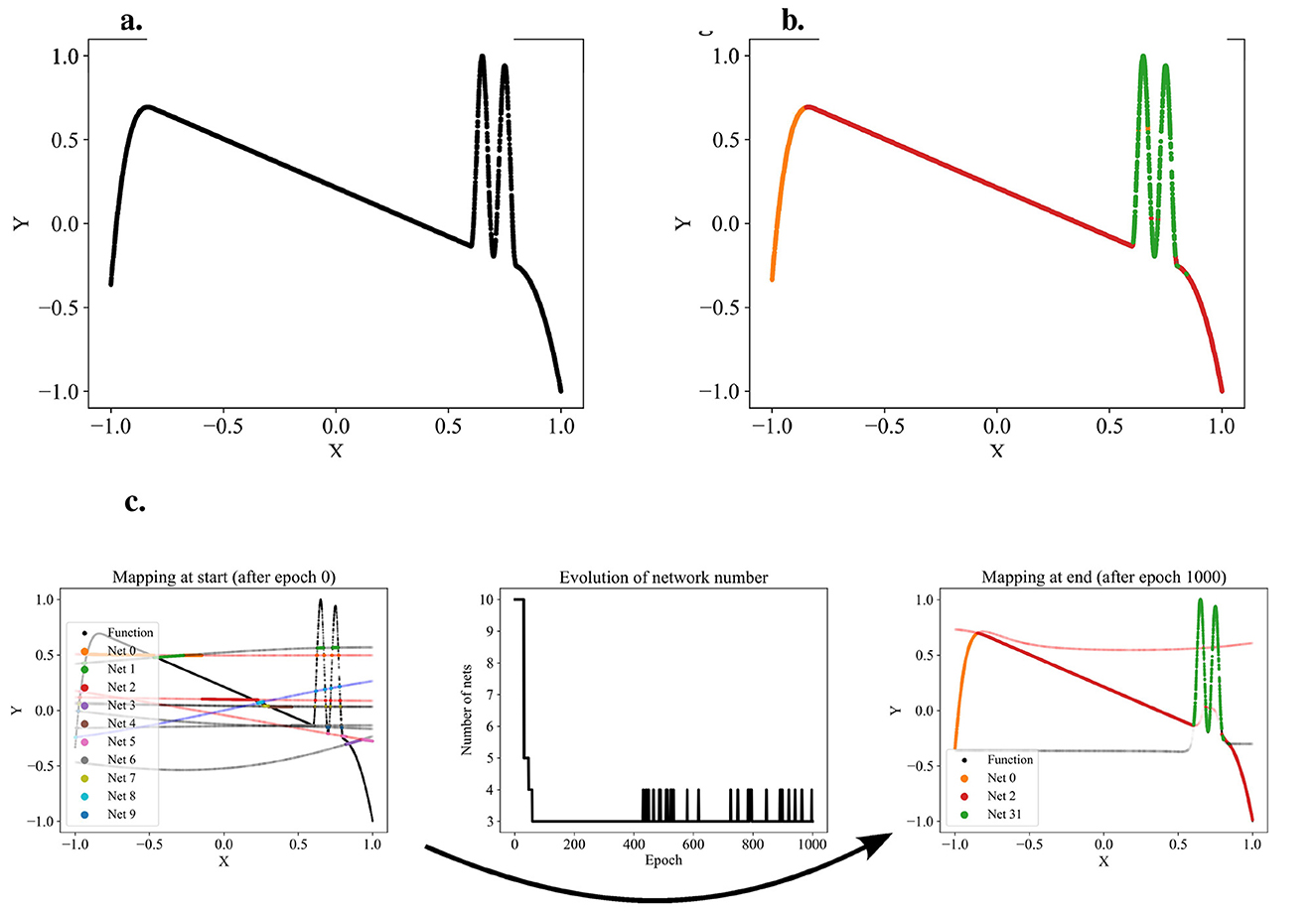 Figure 2. Exemplary partitioning. (a) Presents the self-designed test dataset, while (b) displays an exemplary partitioning result. (c) Illustrates the partitioning process, transitioning from networks with initial random predictions to the orange, red, and green networks each capturing distinct patterns. The process involves adding and removing networks as patterns are identified or networks deemed redundant.