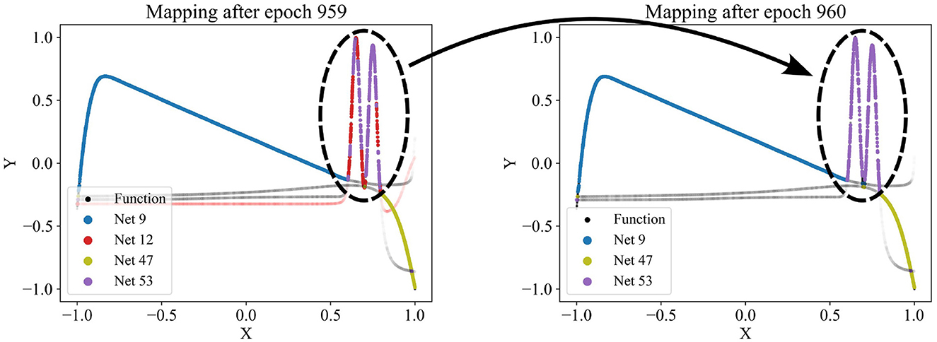 This process—models submitting predictions, ranking the predictions, and training the models on the data points for which they provided the best predictions—is iterated. We call one such iteration an epoch of the algorithm. As the models specialize, we expect the assignments of data points to models to stabilize: a specialized expert will usually submit the best predictions for its domain. After a predefined number of epochs, the assignments of data points to models are considered final. Each model's won data points translate to a separate partition of the dataset. The hyperplanes between the partitions are stored in a support vector machine (SVM), making the partitioning technically available for other applications. Snapshots of the application of the algorithm to a one-dimensional function that we designed as a test dataset are shown in Figure 2. The transition from random predictions at the beginning to specialized experts at the end is clearly visible. The assignments of data points to the specialized experts are translated into the final partitioning.
