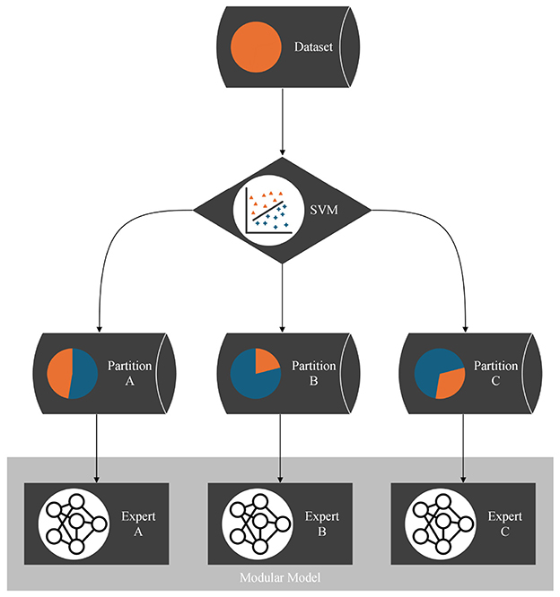 Applying the partitioning algorithm to datasets reveals interesting and valuable insights about the dataset's structure, as illustrated in Figure 2. Additionally, the partitioning can be utilized for various other purposes, such as learning the dataset using a divide-and-conquer approach. Traditionally, the entire dataset is used to train and optimize a single model. However, if the partitioning algorithm detects distinct functional patterns, it may be beneficial to have multiple expert models, each learning only one pattern, instead of pressing all patterns into a single model. Therefore, multiple expert models that each learn one partition are combined into a modular model. The SVM, which incorporates the boundaries between the partitions, serves as a switch between the experts. For each data point, the SVM decides which partition it belongs to and, consequently, which expert model to train or test. The structure of the modular model is illustrated with a flowchart in Figure 5. With this approach, we believe that we can reduce model complexity and increase model accuracy for datasets that are structured by multiple distinct functional patterns with little overlap.