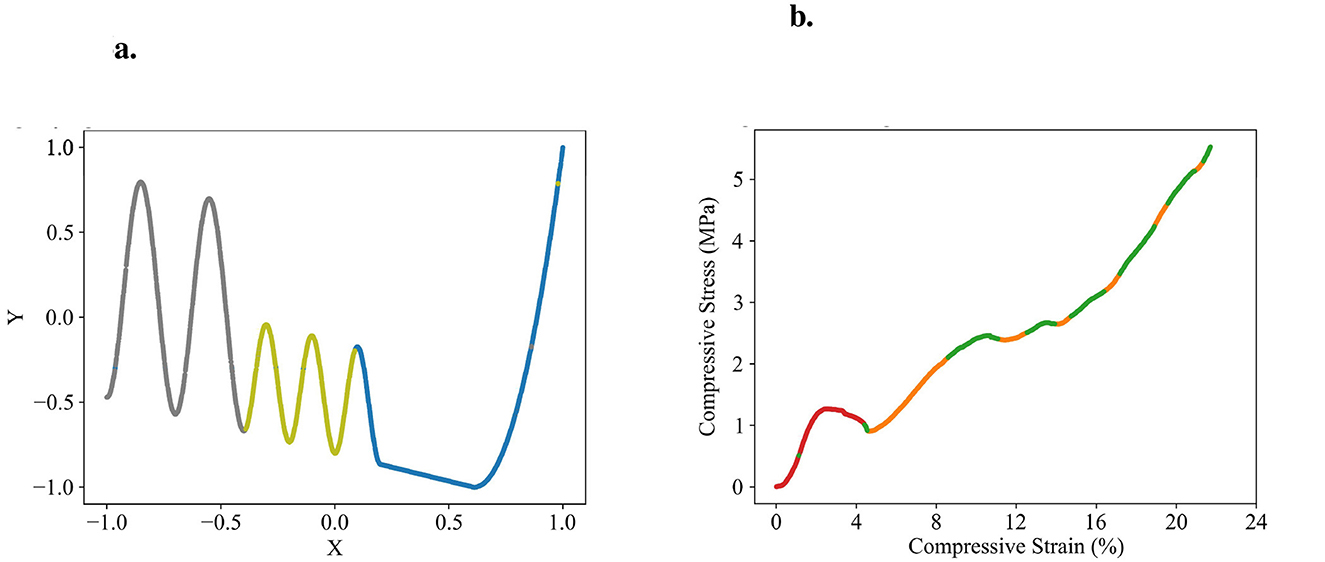 Figure 6. Datasets to test the partitioning algorithm, illustrated with exemplary partitioning results. (a) Self-designed wave-climb function with three patterns identified by the algorithm (gray, green, blue). (b) Porous structure's stress-strain dataset generously provided by Ambekar et al. (2021) with three patterns identified by the algorithm (red, green, orange).