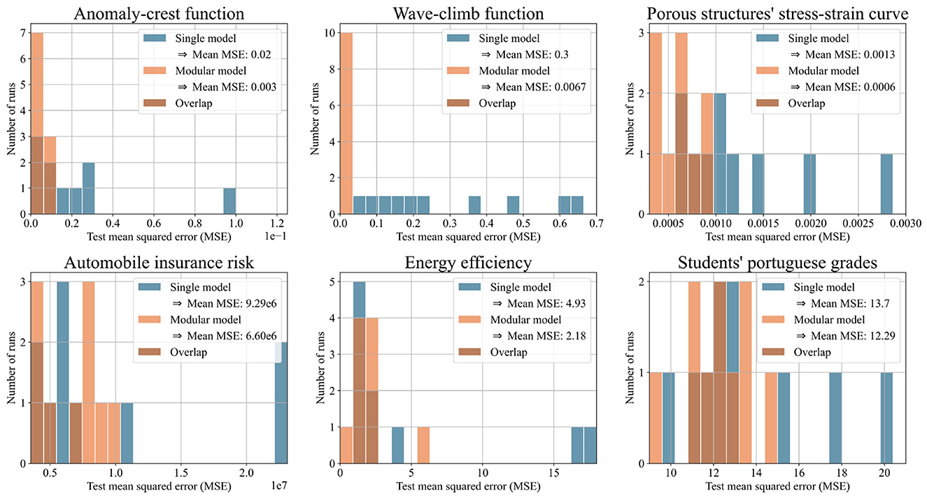 Figure 7. Histograms illustrating the test mean squared error (MSE) of single and modular model for ten runs with each of the six selected datasets. The higher the bars on the left side, the better the performance.