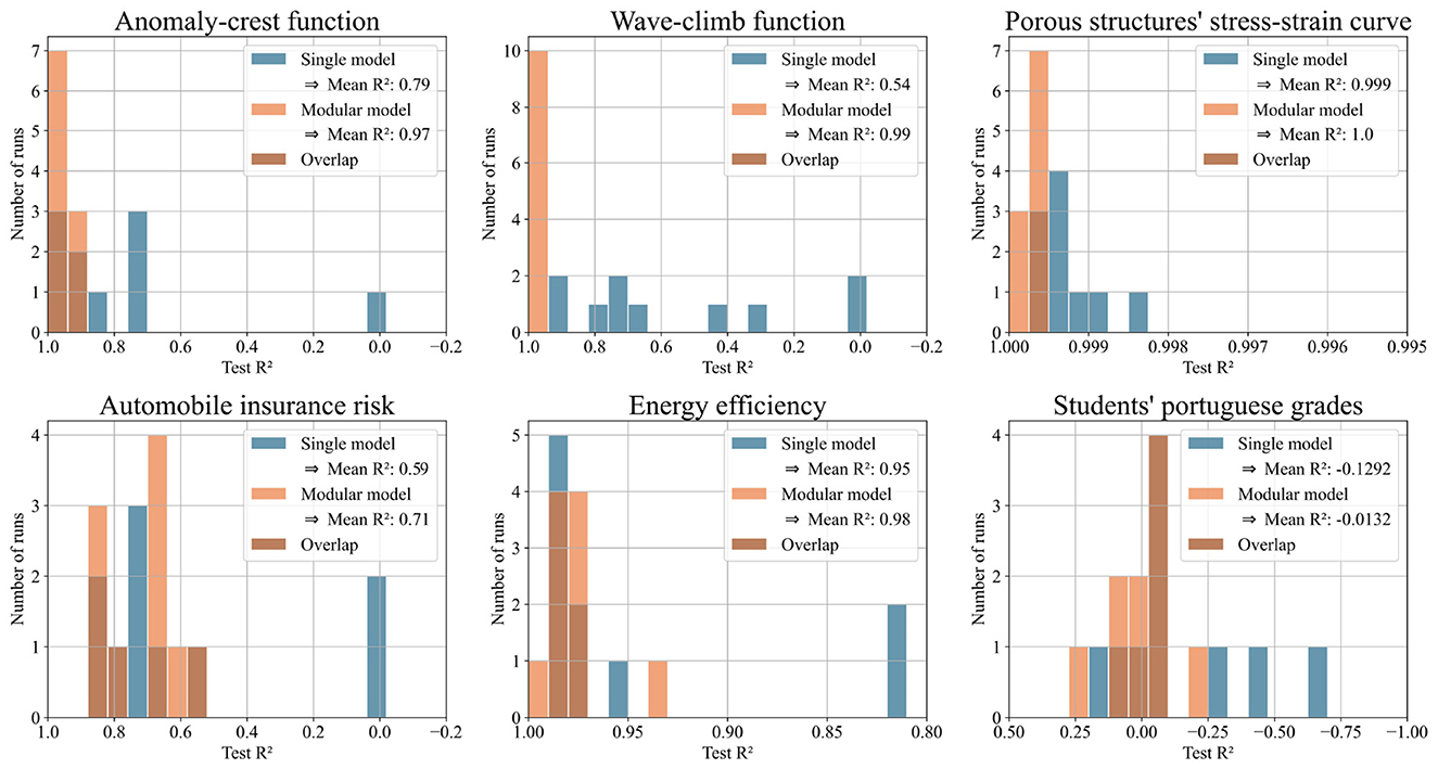 Figure 8. Histograms illustrating the test R2 scores of single and modular model for ten runs with each of the six selected datasets. The higher the bars on the left side, the better the performance.