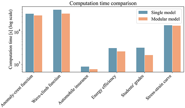 Since training efficiency is key in machine learning, we also compared the training times of the modular model and single model approach. We measured the time required for a 100-trial grid search for hyperparameter tuning. For the modular model, we also included the time to run the partitioning algorithm. Figure 9 presents a bar plot of training times for the six highlighted datasets. The x-axis shows the datasets, the y-axis (log scale) shows computation time in seconds on a standard desktop computer (Intel Core i9-11950H @ 2.60GHz, 64GB RAM, NVIDIA RTX A5000 with 24GB VRAM). Compared to the hyperparameter search, the partitioning algorithm adds negligible time. More impactful is the modular model's use of multiple but smaller models, which speeds up backpropagation. Overall, training times are similar, with a slight advantage for the modular model.