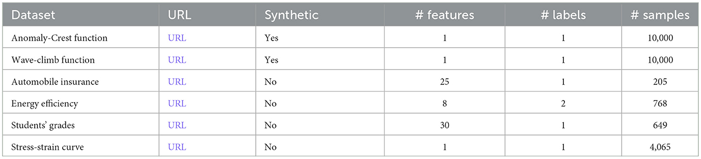 In addition to the one-dimensional datasets, we evaluated our method using 22 popular higher-dimensional real-world datasets from the UCI Machine Learning Repository (Kelly et al., 2024). Our tests focused exclusively on regression problems, though our approach can be readily extended to classification problems. Acknowledging that our assumption of distinct and separable characteristics may not apply to all datasets, we tested these 22 additional datasets to assess the frequency and extent to which the modular model, based on the partitioning algorithm, outperforms a single model (Imran et al., 2020; Cortez et al., 2009; Nash et al., 1995; Palechor and la Hoz Manotas, 2019; Schlimmer, 1987; Cortez and Morais, 2008; Feldmesser, 1987; Yeh, 2018; E and Cho, 2020; Tsanas and Xifara, 2012; Yeh, 2007; Tfekci and Kaya, 2014; Cortez, 2014; Quinlan, 1993; Matzka, 2020; Wolberg et al., 1995; Fernandes et al., 2015; Janosi et al., 1988; Tsanas and Little, 2009; Chen, 2017; Moro et al., 2016; Hamidieh, 2018). A characterization of all test cases is provided in Appendix Table 3.
