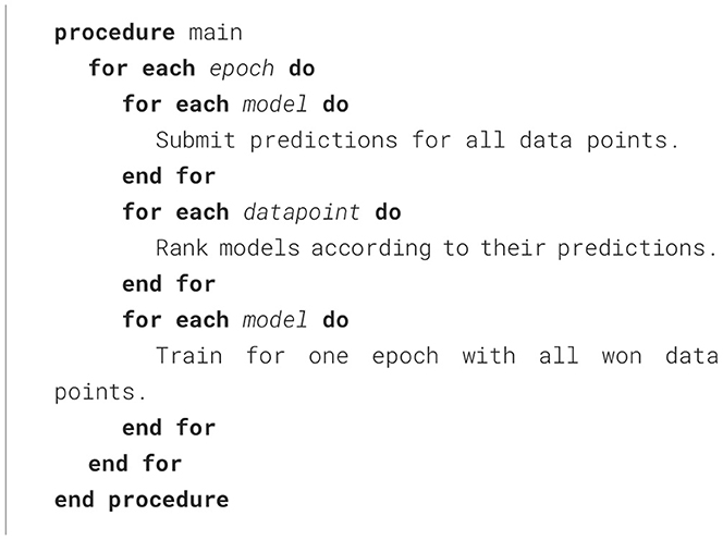 As a reward for providing the most accurate prediction, the winning model is allowed to update its parameters using this subset of data points for one training epoch. The corresponding mean squared error, which in the case of neural networks is backpropagated through the network for optimization, is defined as: