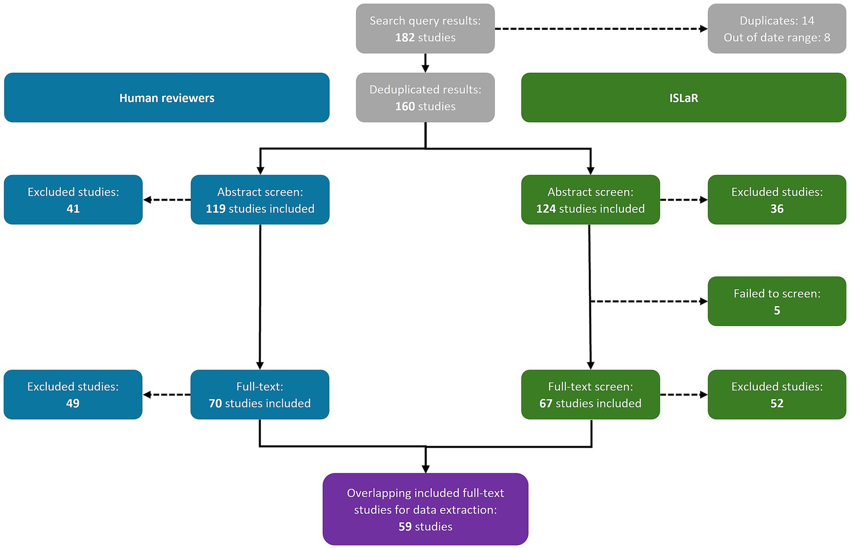 The database search returned 182 studies: 145 from PubMed and 37 from EMBASE (Supplementary Table 1). Both the human reviewers and ISLaR correctly identified and removed 14 duplicates and 8 studies published outside the desired date range, retaining a total of 160 studies for abstract screening (Figure 1). All studies, and their classifications at the abstract and full-text screening stages, are listed in Supplementary Table 5.