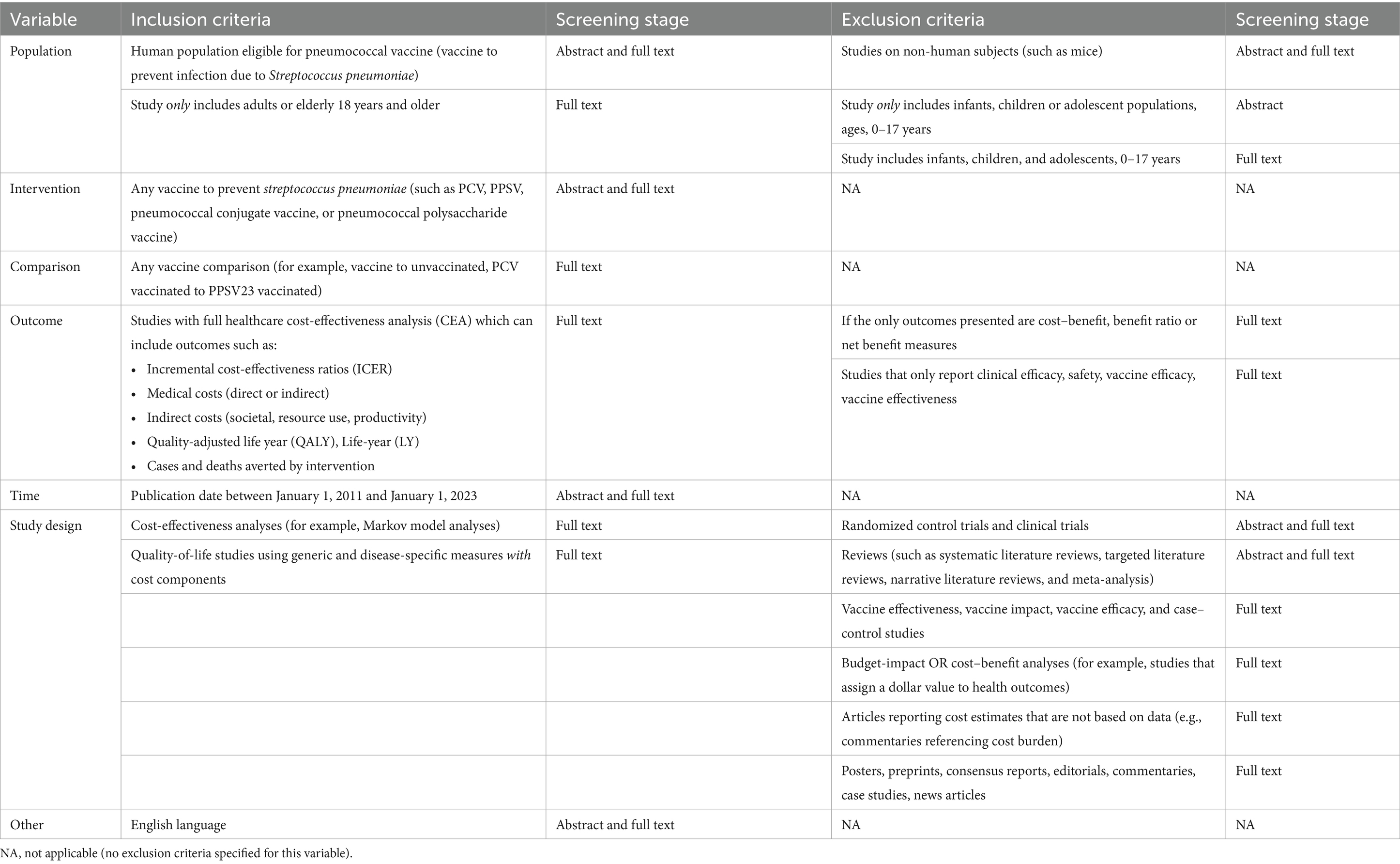 Search strings were manually developed for the PubMed and EMBASE literature databases to identify studies potentially related to the cost-effectiveness of pneumococcal vaccination among adult’s ≥18 years of age (Supplementary Table 1). Study selection was then based on the Population, Intervention, Comparison, Outcome, Time, and Study design (PICOTS) criteria listed in Table 1. We included peer-reviewed studies published in English between January 1, 2011 and January 1, 2023 that conducted cost-effectiveness analyses for any pneumococcal vaccine, compared to no vaccination or any standard-of-care vaccination, among adult’s ≥18 years of age. We excluded studies that reported only clinical outcomes with no cost component, or that reported cost–benefit, benefit ratio, or net benefit measures as the only health economic outcomes. Randomized controlled trials were also excluded, as were reviews, posters, published conference abstracts, preprints, and other non-primary and/or non-peer-reviewed publication types. Different criteria were applied at the abstract and full-text screening stages to emphasize sensitivity at the abstract screening stage and then apply more stringent exclusion criteria to the full texts. This approach is consistent with guidelines created by the Professional Society for Health Economics and Outcomes Research (ISPOR) for the conduct of SLRs that focus on cost-effectiveness outcomes (Mandrik et al., 2021; Wang et al., 2025a; Wang et al., 2025b). For example, the age-based population exclusion criterion applied at the abstract stage was designed to discard studies that included only populations <18 years of age; at the full-text screening stage, we discarded studies that included any population <18 years of age.