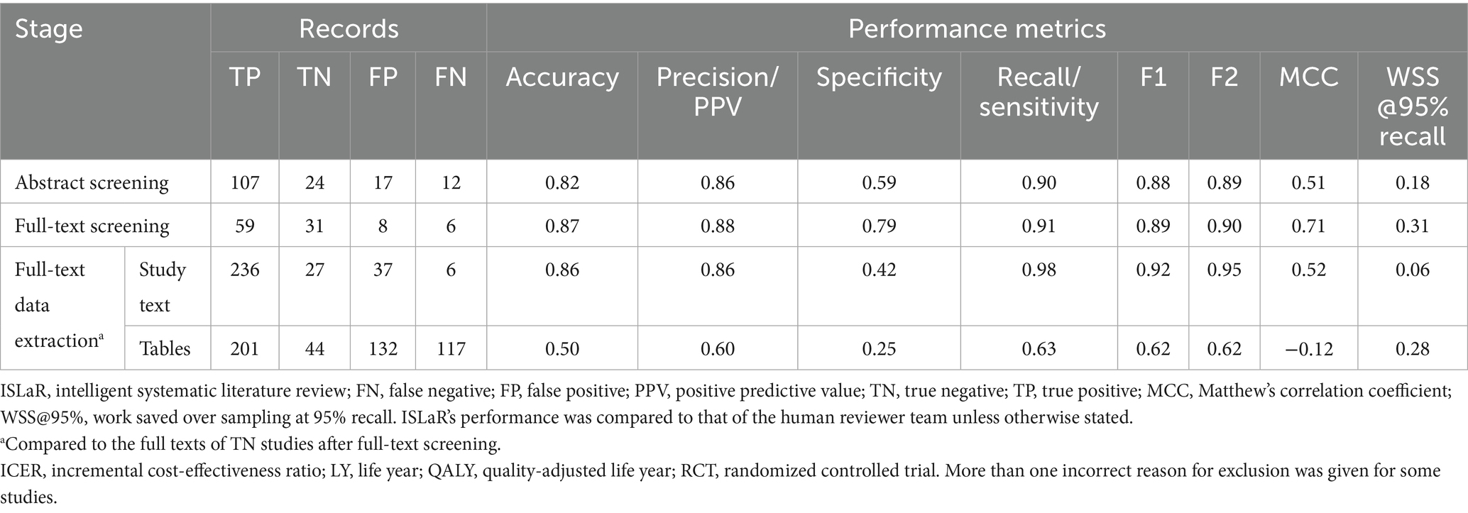 ISLaR’s time savings and performance metrics were broadly in line with those reported in other studies of LLM-based SLR automation (Alshami et al., 2023; Dunn et al., 2022; Gartlehner et al., 2024; Guo et al., 2024; Khraisha et al., 2024; Kohandel Gargari et al., 2024; Landschaft et al., 2024; Li et al., 2024; Matsui et al., 2024; Tran et al., 2024; Wang Z. et al., 2025). The average time taken for the human reviewers to screen each study may not be representative of other SLRs, as cost-effectiveness analyses have a standardized outcome reporting format; ISLaR’s relative time savings may thus be greater for other study types. The low specificity score in the abstract screening task was due to the intentional use of less stringent inclusion and exclusion criteria at this stage compared to the full-text screening stage; as expected, this score improved substantially in the full-text screening task. However, even in this second, more stringent screen, ISLaR’s specificity score was lower than its sensitivity score. This finding is consistent with several other studies (Alshami et al., 2023; Guo et al., 2024; Khraisha et al., 2024; Kohandel Gargari et al., 2024; Matsui et al., 2024; Tran et al., 2024), although a smaller number of studies have reported both high sensitivity and high specificity (Landschaft et al., 2024; Li et al., 2024). Since most SLRs ultimately exclude a substantial number of potentially eligible articles (Sampson et al., 2011; Wang et al., 2020; Yaffe et al., 2012), the use of highly sensitive LLM tools to rapidly screen out obviously irrelevant articles would in itself substantially reduce researchers’ workloads while ensuring that almost all relevant articles are retained for detailed manual review. ISLaR and other LLM-based tools could also find similar applications in first-pass screening of newly published articles that may be eligible for inclusion in living SLRs (Elliott et al., 2014; Wijkstra et al., 2021). Future avenues of development could include exploration of article selection formats other than the current binary include/exclude decision, such as numerical relevance scores and dynamic article ranking systems similar to those included in some NLP-based automation tools (Akinseloyin et al., 2024; Bolaños et al., 2024; Oude Wolcherink et al., 2023; van Dijk et al., 2023).