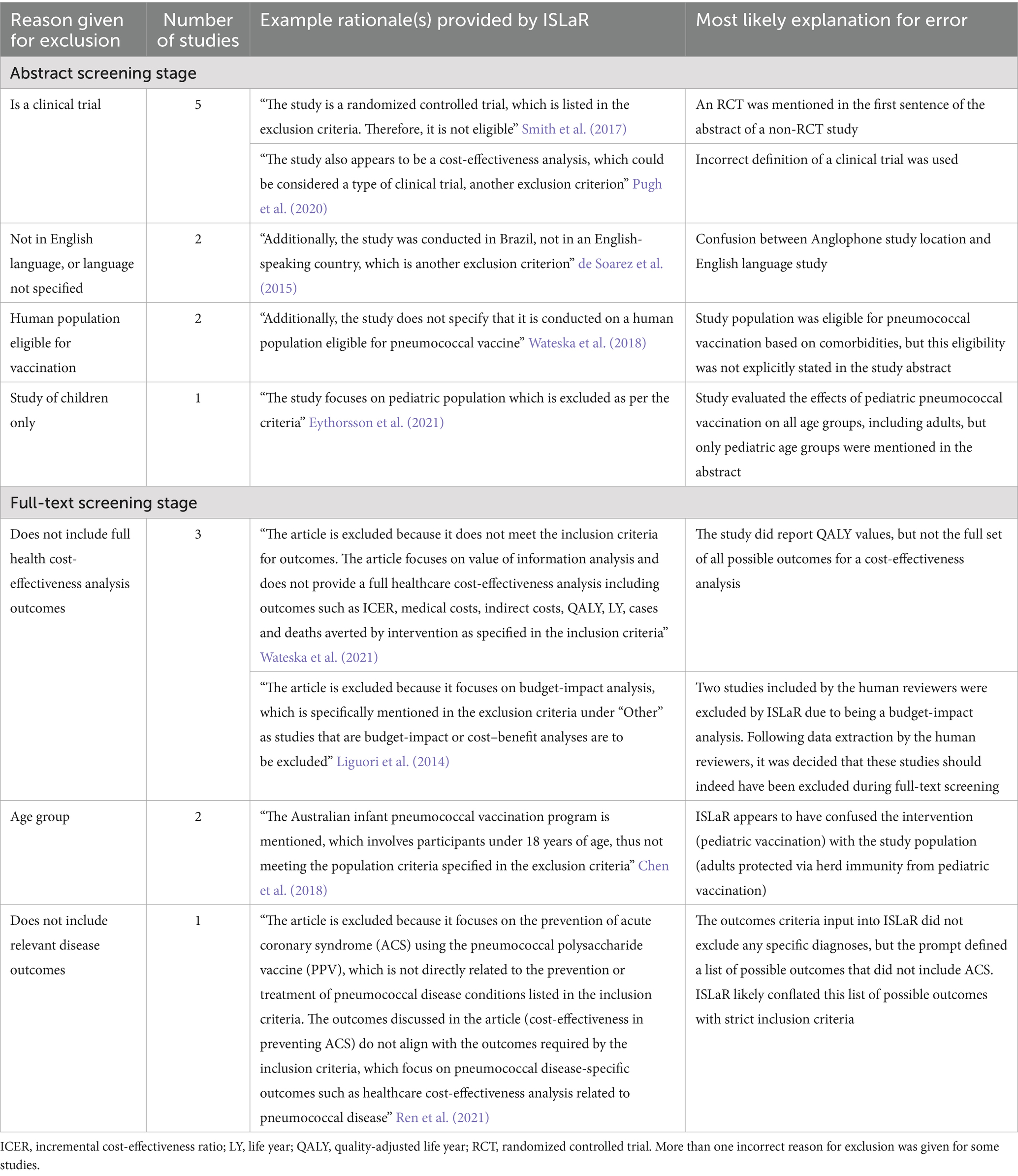 ISLaR’s FP abstract selections also included errors in recognizing English-language studies (potentially due to some non-English-language studies having an English-language version of the abstract), as well as posters, preprints, and non-primary studies such as editorials, commentaries, and news articles that were correctly excluded by the human reviewers. Human reviewers also excluded nine abstracts that did not assess cost-effectiveness outcomes in an adult population, but that ISLaR erroneously included; in six cases the human reviewers’ exclusion decision was based on information that was also available to ISLaR (for example, use of the words “in children” in the study title), whereas in the other cases the decision was based on expert knowledge that had not been included in the ISLaR prompt (for example, knowledge that the study’s intervention vaccine is only licensed for use in pediatric populations).