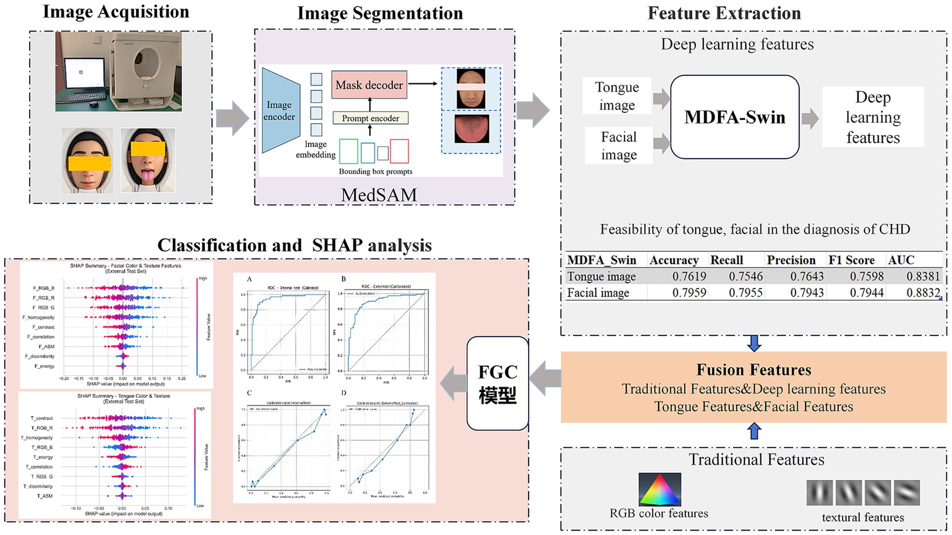 Flowchart detailing a facial image analysis system for medical diagnosis. It includes sections on Image Acquisition, Segmenting with MedSAM, Feature Extraction using MDFA-Swin, and Classification with SHAP analysis. Performance metrics display accuracy, recall, precision, F1 score, and AUC for tongue and facial images. Fusion of traditional and deep-learning features integrates tongue and facial traits.