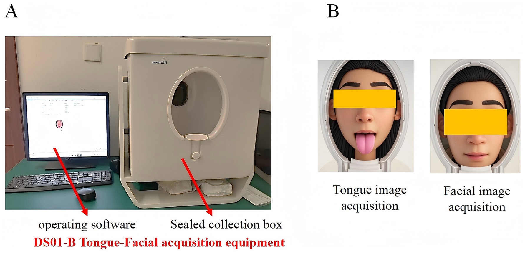 Panel A shows a computer with operating software connected to a DS01-B Tongue-Facial acquisition equipment, featuring a sealed collection box. Panel B displays two facial illustrations: one sticking out the tongue and the other with a neutral expression. Both are labeled for tongue and facial image acquisition, respectively.