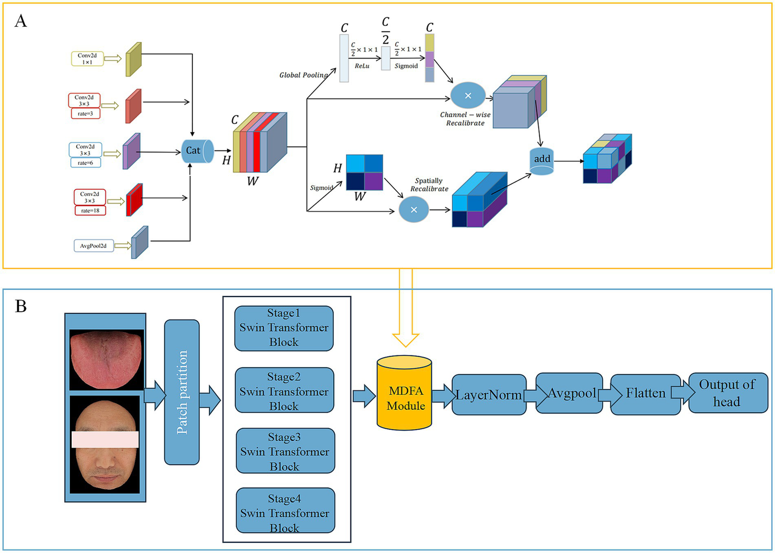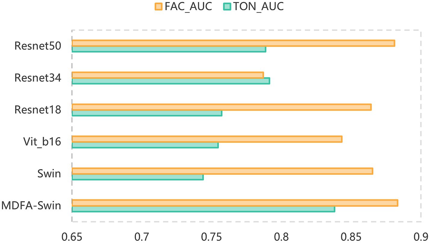 To effectively capture high-level semantic features (Deep Feature) embedded in tongue and facial images, this study adopts the MDFA-Swin network (Figure 4) as the backbone model for deep feature extraction. The Swin Transformer (Liu et al., 2021) adopts a hierarchical structure combined with a shifted window-based multi-head self-attention mechanism, which offers strong local perception and global modeling capabilities. This makes it particularly well-suited for analyzing medical images of the tongue and face, which often exhibit unstructured morphology, fine-grained variations, and blurred boundaries. To enhance the model’s ability to capture local details, a Multi-scale Dilated Fusion Attention (MDFA) module—integrating multi-scale dilated convolutions and attention mechanisms—is incorporated. This component strengthens the model’s capacity to perceive and represent key diagnostic features. During the feature extraction process, both tongue and facial images first undergo initial transformation through a patch partitioning and linear embedding module. These representations are then processed through multiple Transformer blocks to progressively integrate cross-scale contextual information. For high-level feature representation, we retain the global feature output preceding the classification head—specifically, the feature vector obtained after the ‘avgpool’ operation but before the ‘flatten’ operation. This semantic-level abstraction provides discriminative power for subsequent feature fusion and disease prediction tasks. The final deep feature is flattened into a one-dimensional vector of size 768 using ‘torch.flatten (x, 1)’. We further evaluated the discriminative power of deep features extracted by MDFA-Swin from tongue and facial images, and conducted systematic comparisons with several mainstream baseline models, including ViT-B/16, Swin-Small, Swin-Tiny, ResNet18, ResNet34, and ResNet50. Experimental results demonstrated that MDFA-Swin outperforms these baselines across multiple performance metrics, confirming its effectiveness and suitability for tongue and facial image analysis tasks.