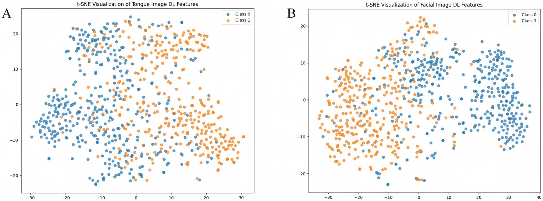 In traditional Chinese medicine (TCM), it is believed that internal pathological changes can be inferred through external bodily manifestations—a concept known as ‘observing the exterior to understand the interior’ (司外揣内) (Liang and Gu, 2021). Tongue diagnosis and facial diagnosis, as integral components of TCM diagnostics, assess changes in tongue appearance and facial features to reflect the circulation of qi and blood as well as the functional state of internal organs, thereby supporting disease diagnosis (Xie et al., 2021; Duan et al., 2024b). Modern studies have shown that tongue and facial features may serve as effective biomarkers for the diagnosis of CAD. Anatomically, the blood supply to the tongue is closely related to the coronary circulation (Bavitz et al., 1994; Wu et al., 2007). Coronary atherosclerosis can lead to myocardial ischemia and impair peripheral microcirculation, particularly the microcirculation of the tongue, resulting in abnormal changes such as a dark red or bluish-purple tongue body or the presence of petechiae and stasis spots (Kagami et al., 2012; Wang et al., 2022). Clinical observations have shown a correlation between tongue color features and the degree of coronary artery stenosis in patients with CAD (Xia et al., 2023; Li et al., 2024). In addition, facial features such as complexion and skin texture are also associated with CAD risk; patients often exhibit signs such as a dull facial appearance and dark red lips (Christoffersen et al., 2014; Christoffersen and Tybjærg-Hansen, 2016). Lin et al. (2020) through a multicenter prospective study, demonstrated the clinical feasibility of a CAD diagnostic model based on facial images, achieving an AUC of 0.730, further supporting the application value of facial features in CAD screening. In summary, tongue and facial characteristics are closely related to CAD, suggesting that these non-invasive physiological indicators have the potential to serve as novel biomarkers for CAD diagnosis and risk assessment.